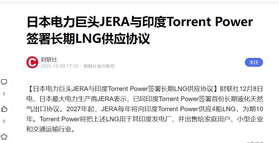 快讯! 日本宣布了 12月8日,日本最大电力生产商JERA宣布,已同印度Torrent Power签署首份长期液化天然气出口协议。从2027年起,JERA每年将向印度供应4船LNG,为期10年。这是日本电力巨头首次与印度企业签订长期LNG供应合同,标志着两国能源合作迈入新阶段。 可能有人要问,日本自己都是出了名的“资源穷国”,能源几乎全靠进口,怎么还反过来卖LNG给别人?这就得说日本的算盘多精了。 JERA这家公司,本来是全球顶级的LNG买家,每年在全世界买的LNG超过3000万吨,比很多国家的全年进口量都多。 今年6月,它悄悄跟美国签了个20年的长期采购协议,一口气锁定了550万吨LNG,更妙的是拿到了“灵活转运”的特权——国内用不完的货,能随便转卖给其他国家。 这操作跟咱们生活里的“囤货赚差价”一个意思,美国现在LNG产能过剩,价格低,日本先把便宜货锁下来,再高价卖给急需能源的印度,中间的利润能翻好几倍,把“中间商赚差价”玩到了极致。 再看印度这边,完全是“病急乱投医”的架势。这些年印度经济发展快,工厂多了,家里用电的也多了,对天然气的需求像坐火箭一样涨。 2024年印度LNG进口量飙到2700万吨,成了全球第四大进口国,可国内自己产的天然气连需求的一半都不够,超过50%全得靠进口“续命”。 更要命的是,印度的气田要么快枯竭了,要么藏在深海里不好开采,储气的罐子和输送的管道也烂得一批,去年夏天就因为天然气不够,西部几个邦停了好几天电,工厂停摆,老百姓连空调都开不了。 这次跟日本签单的Torrent Power,是印度响当当的电力公司,负责 Ahmedabad、Surat 这些大城市的供电,服务着287万用户,它要是供不上电,整个印度西部都得乱套。 有人说印度这是找了个稳定供应源,是好事?可别被表面骗了。印度以前主要靠卡塔尔和澳大利亚买气,卡塔尔占了它进口量的35%,澳大利亚占25%,本来就有点依赖别人。 今年2月,卡塔尔刚跟印度签了20年的大合同,每年供750万吨,总价值780亿美元,相当于把印度一半的LNG需求都包了。 现在又加个日本,看似供应多元化了,实则是把能源安全的“把柄”多交了一家,以后不管是卡塔尔涨价,还是日本卡脖子,印度都得受着。就像咱们买菜,本来只跟一家菜摊打交道,现在又找了第二家,看着有选择,可两家要是串通涨价,吃亏的还是自己。 其实日印早就眉来眼去了,这次LNG协议就是之前合作的延续。今年9月,两国刚敲定氢能源合作,日本出1410亿元的补贴和技术,印度出太阳能、风能这些可再生能源资源,算盘打得叮当响。日本的心思很明确,就是想用能源当“绳子”,把印度这个大市场绑在自己身上。 现在全球LNG供大于求,亚太地区的气价一直在跌,日本选这个时候冲进来,既能把美国的富余产能消化掉,又能抢占印度市场,还能扩大自己在亚洲的影响力,一举三得。 但这事儿的风险也不小,十年的协议可不是闹着玩的。国际气价就像坐过山车,2022年欧洲能源危机的时候,LNG价格涨了十倍,去年又跌回谷底,万一以后价格暴涨,日本会不会撕毁协议优先满足自己?或者地缘政治出点问题,比如美国限制日本转售,这60万吨LNG就成了泡影。 印度也不是没吃过亏,之前跟澳大利亚签的LNG协议,就因为气价暴跌亏了上百亿,这次跟日本合作,说不定又是一个“坑”。 说到底,这根本不是什么“能源联姻”,就是两个国家各取所需的利益交换。日本拿着从美国买的便宜气,赚印度的“辛苦钱”,顺便巩固自己的地位; 印度则是在本土能源产业不行的情况下,没办法的无奈选择,一边喊着“能源自主”的口号,一边疯狂签进口协议,自相矛盾。 现在全球能源格局就像一盘大棋,美国、卡塔尔、澳大利亚是老牌玩家,日本靠着“低买高卖”成了新的中间商,而印度这样的需求大国,只能在里面小心翼翼地找靠山。这场看似双赢的交易,没有谁真心帮谁,全是为了自己的腰包。 咱们看着热闹的同时也得明白,能源安全从来都不是靠别人施舍来的,只有自己手里有真东西,才能在国际上硬气起来。这道理,不管是国家还是咱们老百姓过日子,都一样管用。