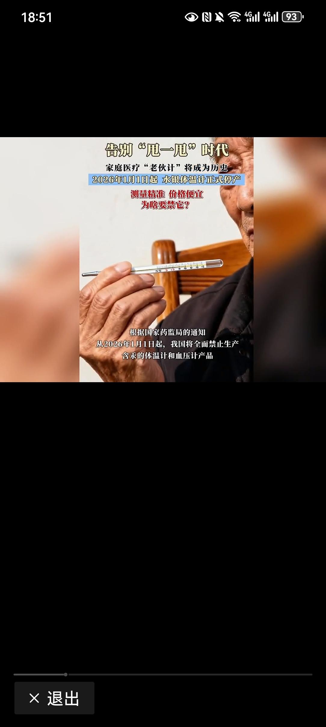 2026年起,水银体温计、血压计要“退场”了 〔水银小科普:水银在常温下是一种不透明的银色液体,它属重金属,不易溶于水,但易挥发,它具有毒性,特别是对人的肝脾肾有害,对人的消化道具有腐蚀性,孕妇禁忌〕 国家药监局明确:2026年1月1日起,禁止生产含汞体温计、血压计,这一调整既呼应环保公约,也会影响日常健康监测: 1. 对消费者:现有产品仍能正常用 已取得注册证的含汞体温计、血压计,在注册证有效期内可继续流通、使用;有效期满后虽不能续证生产,但家庭已有的产品只要没损坏,仍可正常使用。 2. 对行业:加速无汞产品替代 目前电子体温计、电子血压计等无汞产品技术已成熟,此次禁令会推动市场全面切换至更环保的替代产品,也会倒逼企业完成产线升级。 3. 对环保:减少汞污染风险 汞是有毒重金属,含汞器械破损后易造成土壤、水源污染,且汞蒸气会危害人体健康。禁令落地后,能从源头减少汞的环境排放,契合《关于汞的水俣公约》的环保目标。 这次禁令不是“一刀切”禁用现有产品,而是从生产端掐断含汞器械的新增供给,既兼顾了居民现有使用需求,也推动健康监测工具向更环保的方向升级。 你对国家有关部门2026年开始禁止生产含汞体温计和含汞血压计有何看法呢?请在评论探讨 〔文章衔接〕我帮你整理一份方便后续替换参考、替代产品单: 体温计:电子体温计、红外体温计等 血压计:电子血压计、无汞台式血压计等。 点亮〔收藏和关赞〕你我共同成长