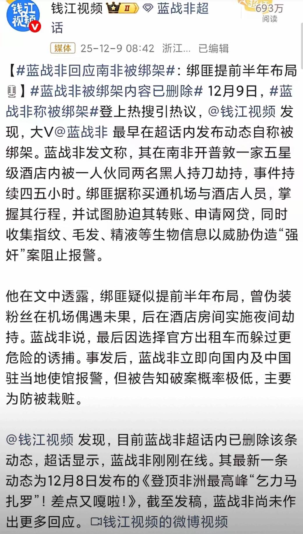 首先我觉得绑架蓝战非的人很可恨。 但是为啥好多人都在去强调绑匪是中国人,这其实我觉得无论是哪国人,绑匪都是可恶的,但是故意去强调(甚至有些人阴阳怪气)这不太好吧。客观角度来看,蓝战非在国内的知名度相对于国外要高很多,所以绑匪是中国人的概率也相对大一些(当然不是说他就该被绑架)。 就好比你是一个外国人,你被其他国家人绑架的概率也没有被本国人绑架的概率高,所以这种故意强调是中国人,甚至搞一些阴阳怪气的不太可取吧。