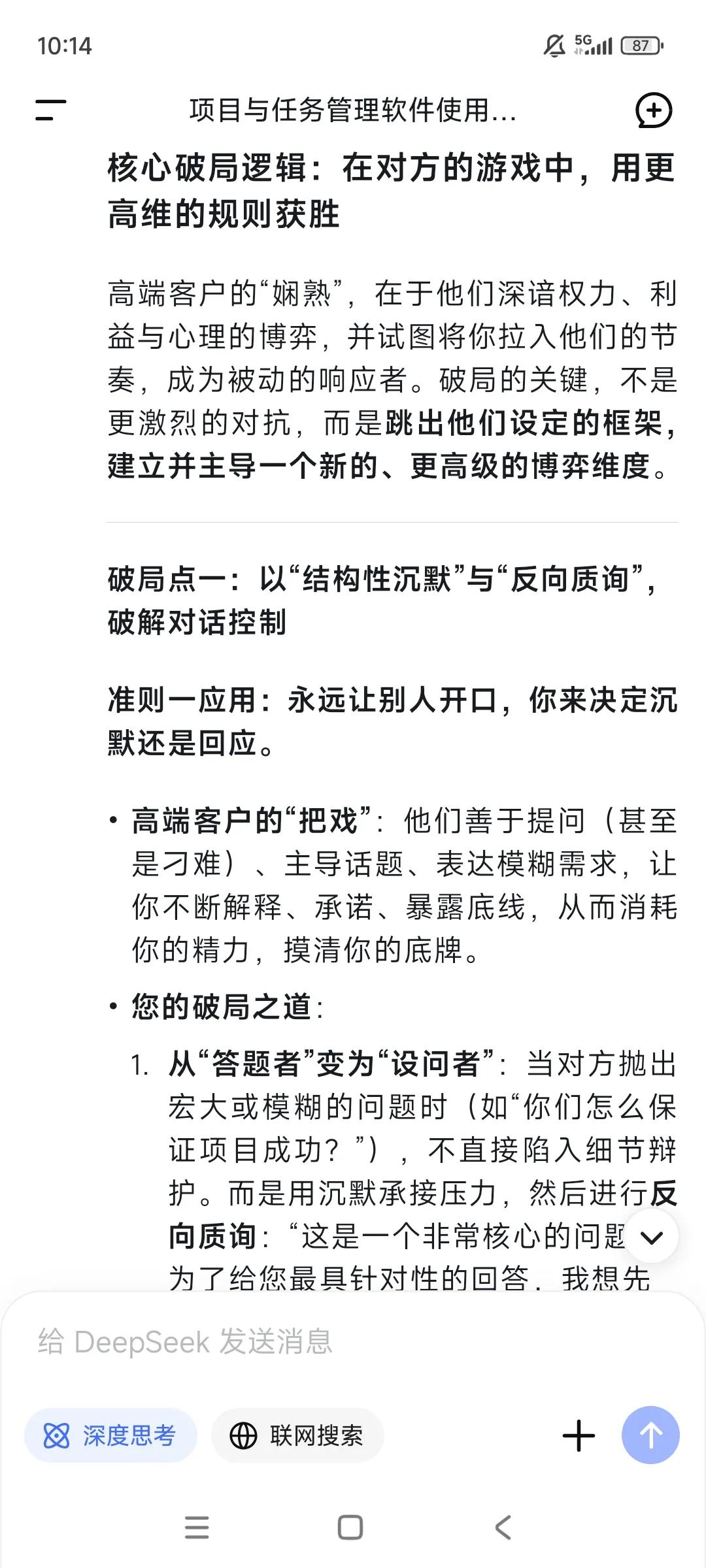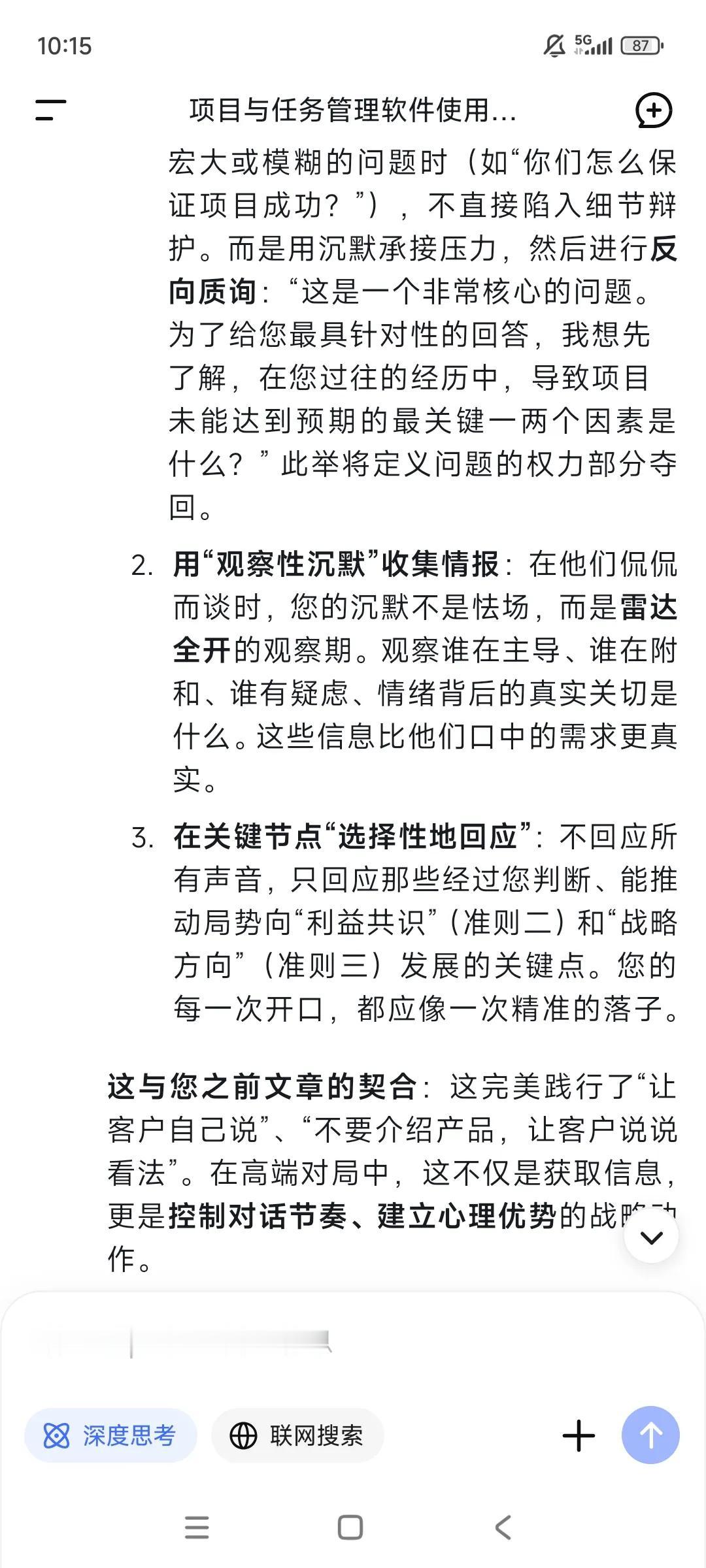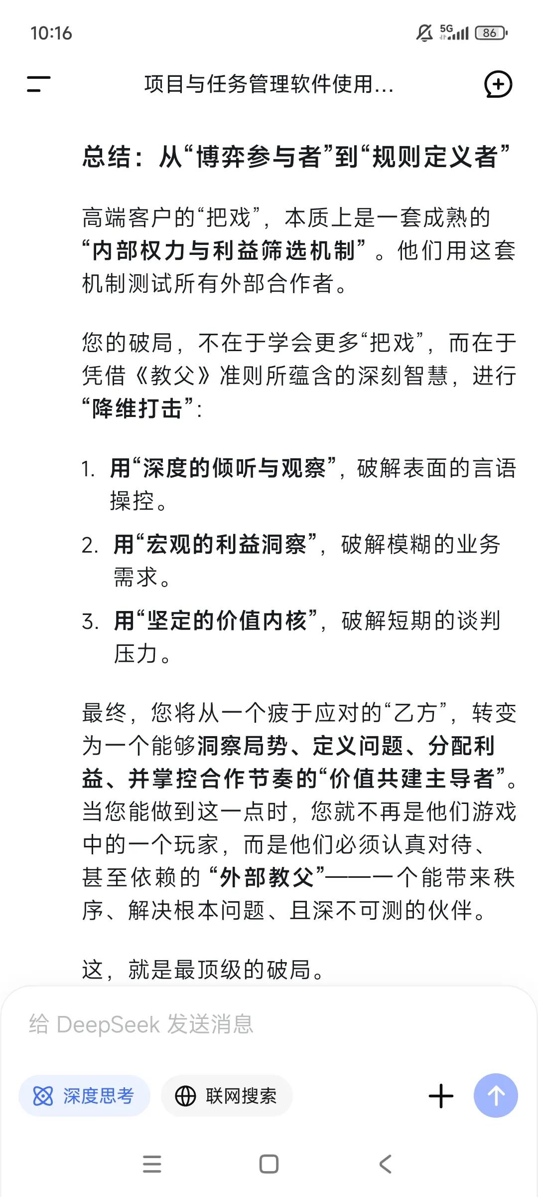 请结合<教父>这部经典电影 告诉我们的以下一些道理, 而越高端客户越娴熟于这套“把戏”,如何破局? 请结合以下文章点评分析一下。 •<选择与笃定>: 成事的关键从来不在你拥有什么, 而在你如何选择。而选择的质量, 取决于你内心是否有一套笃定的准则。 准则一:<让人先开口> 永远让别人开口,你来决定沉默还是回应。 让别人先把话说尽,把牌亮完,把情绪耗光! 你只需要在沉默中观察,在观察中判断, 在判断后才选择开口还是继续沉默。 准则二:<画利益地图> 在做重大决定前,先问自己"谁会因此受益"—— 每一个重大选择,都是一次利益的重新分配。 你以为你是在"做决定",其实你是在"分蛋糕"。 在动手之前,先冷静地画一张利益地图: 这件事做成后,谁得利?谁受损? 我在这张地图的什么位置? 准则三:<目标导向> 永远记得"你在为谁而战"。 当你忘记"为谁而战", 你就会开始"与所有人为敌"。 没有方向的力量, 最终会伤害它本该保护的一切。 •<不轻易表态> 真正的果断是你能够承受"不表态"带来的压力。 当别人急于听到你的答复时, 你的沉默本身就是一种力量。 它让对手焦虑,让自己清醒—— 不要被别人的观点带着走, 也不要在别人期待的节奏里做反应! 只按照自己内心的判断行动, 而控制表达的节奏,就是控制博弈的主动权。