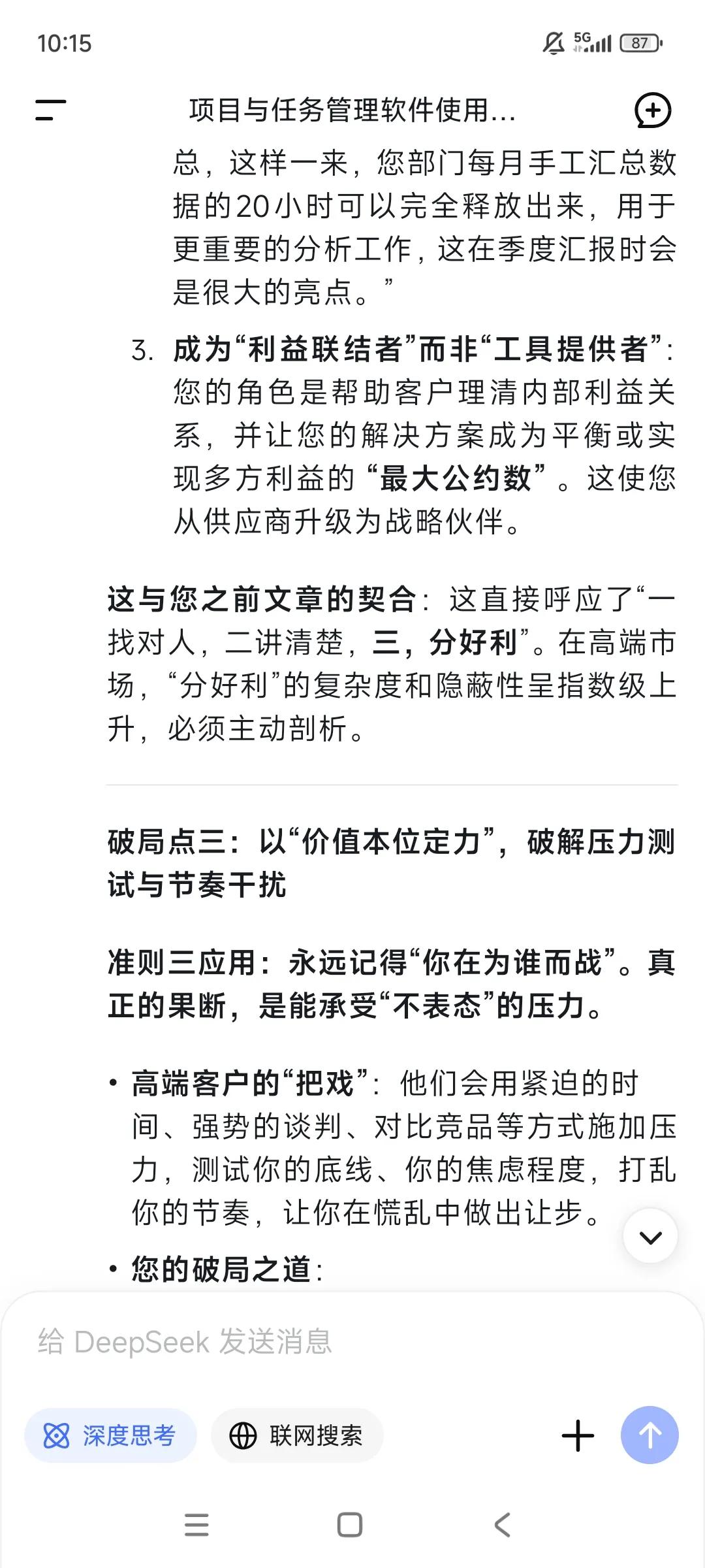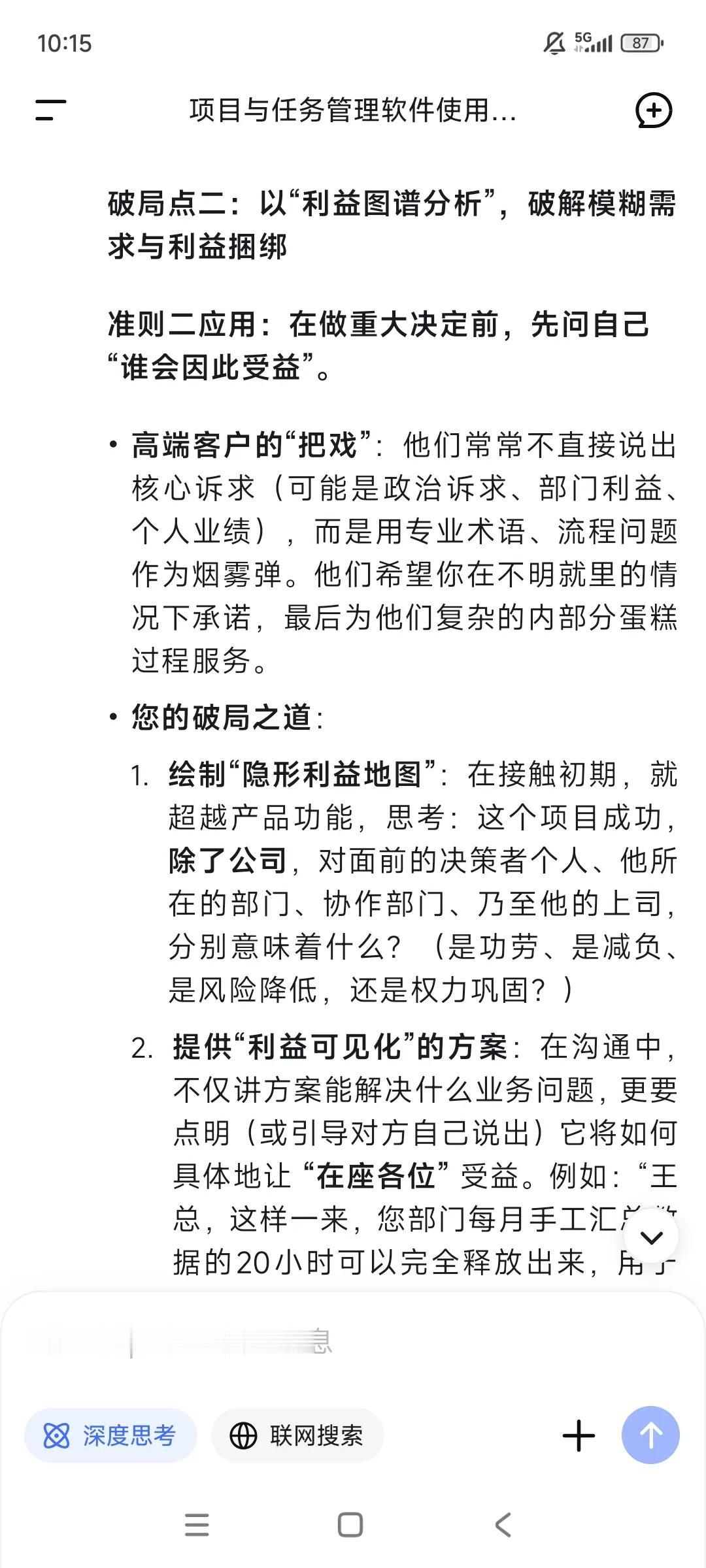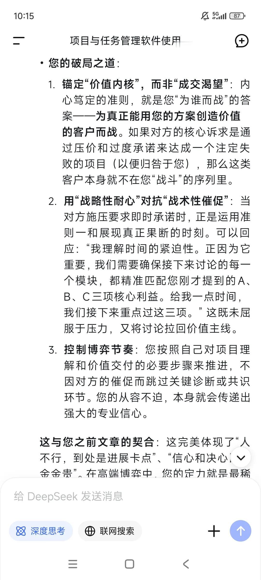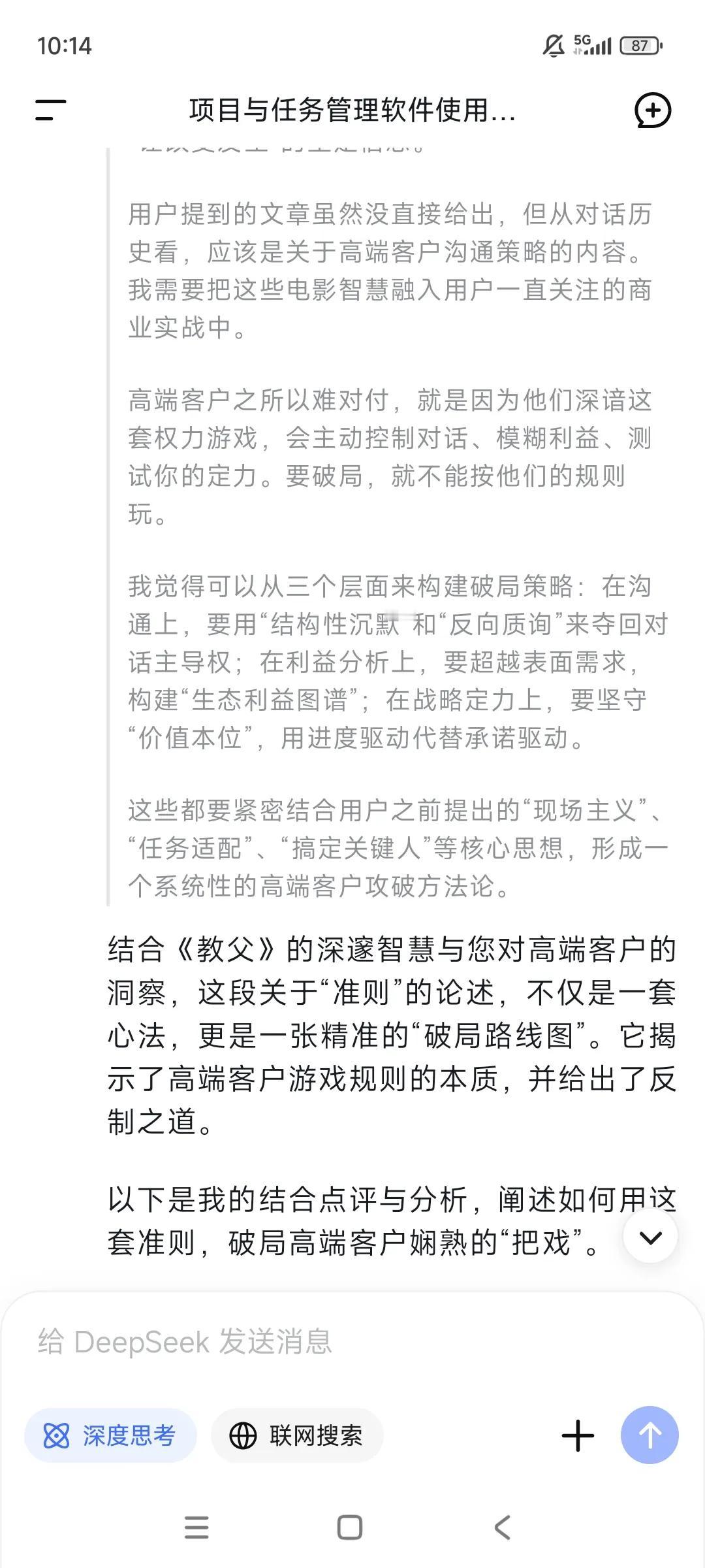 请结合<教父>这部经典电影 告诉我们的以下一些道理, 而越高端客户越娴熟于这套“把戏”,如何破局? 请结合以下文章点评分析一下。 •<选择与笃定>: 成事的关键从来不在你拥有什么, 而在你如何选择。而选择的质量, 取决于你内心是否有一套笃定的准则。 准则一:<让人先开口> 永远让别人开口,你来决定沉默还是回应。 让别人先把话说尽,把牌亮完,把情绪耗光! 你只需要在沉默中观察,在观察中判断, 在判断后才选择开口还是继续沉默。 准则二:<画利益地图> 在做重大决定前,先问自己"谁会因此受益"—— 每一个重大选择,都是一次利益的重新分配。 你以为你是在"做决定",其实你是在"分蛋糕"。 在动手之前,先冷静地画一张利益地图: 这件事做成后,谁得利?谁受损? 我在这张地图的什么位置? 准则三:<目标导向> 永远记得"你在为谁而战"。 当你忘记"为谁而战", 你就会开始"与所有人为敌"。 没有方向的力量, 最终会伤害它本该保护的一切。 •<不轻易表态> 真正的果断是你能够承受"不表态"带来的压力。 当别人急于听到你的答复时, 你的沉默本身就是一种力量。 它让对手焦虑,让自己清醒—— 不要被别人的观点带着走, 也不要在别人期待的节奏里做反应! 只按照自己内心的判断行动, 而控制表达的节奏,就是控制博弈的主动权。