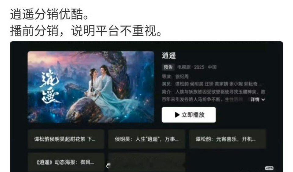 🥝把谭松韵,侯明昊《逍遥》分销👖了,临开播分销,说明平台不看好,加上分销宣传肯定降级,这剧危了