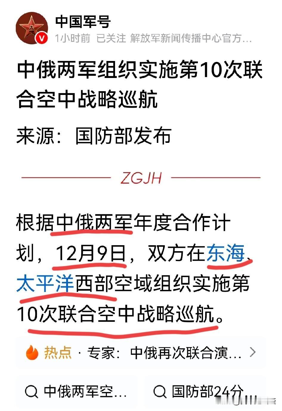 据中国军号头条号最新消息,中俄两军12月9日,共同在【东海】、【太平洋西部】空域组织实施第10次联合空中战略巡航。意义重大!!! 再联想到我辽宁舰编队的所在位置和雷达照射日方f15战机的事情,这几天的事你不敢想! 五常中的两个实力大国战略巡航,记得以前好像都是绕日本群岛转一圈,而且日方还是一如既往的派出御用摄影师再拍个美照! 而且中俄还都是日本的邻居,搬也搬不走的邻居。日方唯一能依靠的就是美国了,但此刻美国又在做什么! 希望日方早日看清形势,找准自己的位置,做点让邻居们开心的事不好吗?! 哦对了,还有一次中俄反导演习,把这个差点忘了[呲牙],看看,多密集!!! 中俄合作演习 如何评价中俄反导联合演习 你如何看待中俄联合反导演习 中俄战略巡航