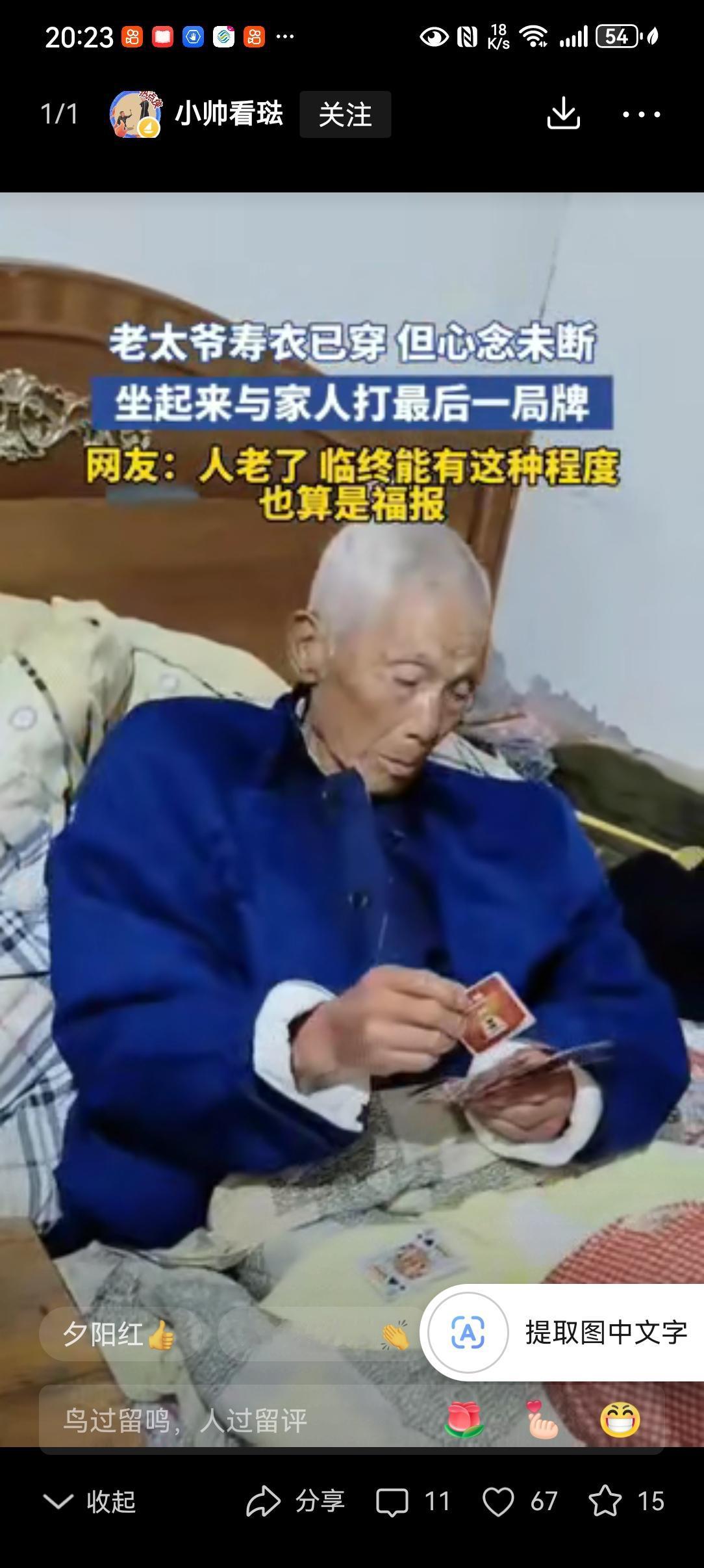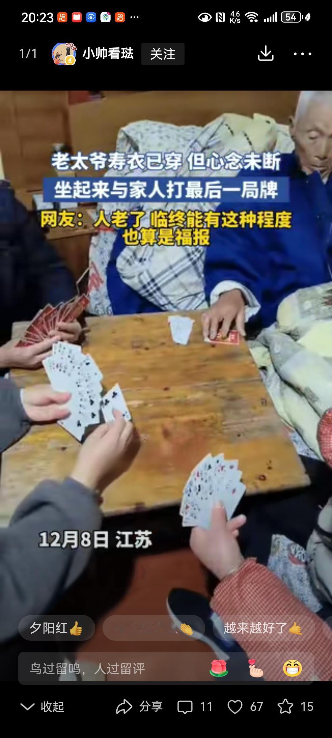 江苏一老人在家剩下最后一口气,家人们见状立马给老人穿上了寿衣,纷纷在床前等着老人离开。不料,老人突然清醒坐起来想跟家人打牌,家人们也是很配合的和老人完成这最后一局牌!网友:“回光返照!” 江苏一位男子接到家里通知,说老太爷快不行了,赶紧连夜赶回老家。 一进门就看见家人围着病床,正给老太爷穿寿衣。家人说,是老太爷自己提的,觉得剩最后一口气了,提前穿好省得麻烦。 寿衣的扣子还没扣利索,原本奄奄一息的老太爷,突然眼睛一睁坐了起来,声音清亮地说要打牌。 一家人又惊又喜,心里清楚大概率是回光返照,却没人拒绝,赶紧凑到床边陪老爷子开局。 拍摄者说,那天没人提难过的事,就陪着老太爷安安稳稳打完了最后一局牌。 网友看了纷纷感慨,这才是真正的视死如归,老爷子心态太通透了。 还有网友留言,这局必须让老爷子赢,也算圆了老人最后一个小心愿。 没有撕心裂肺的告别,只有一场温暖的牌局。这份从容与孝顺,比任何仪式都动人。 老太爷一辈子性情豁达,儿女孝顺,或许就是这份圆满,让他能笑着走完最后一程。