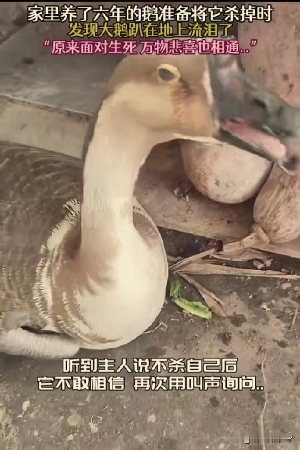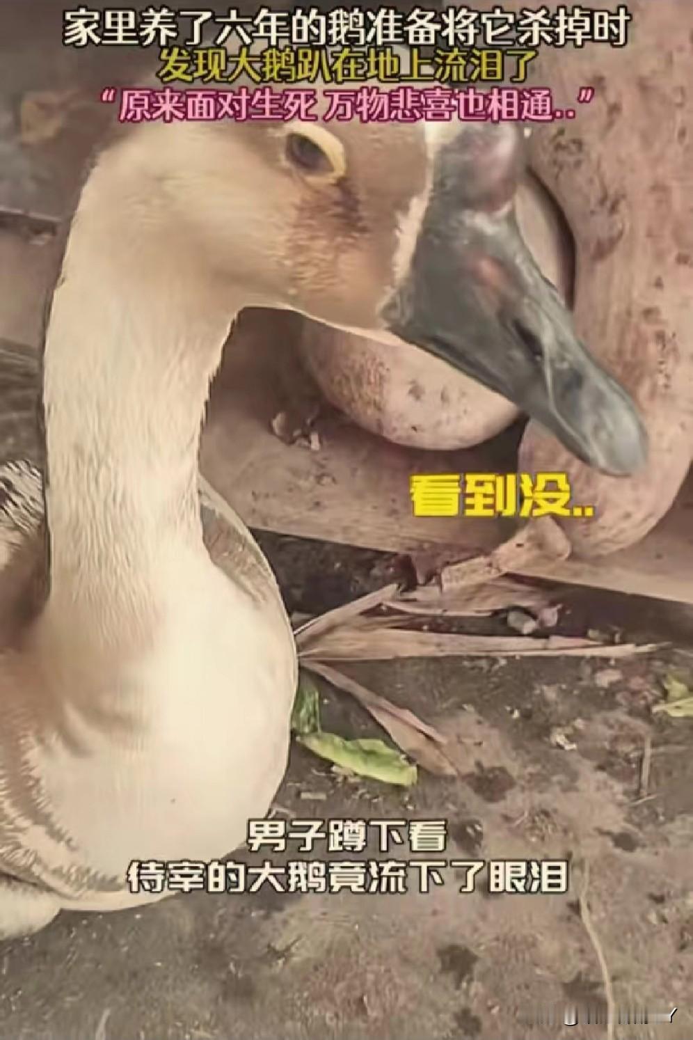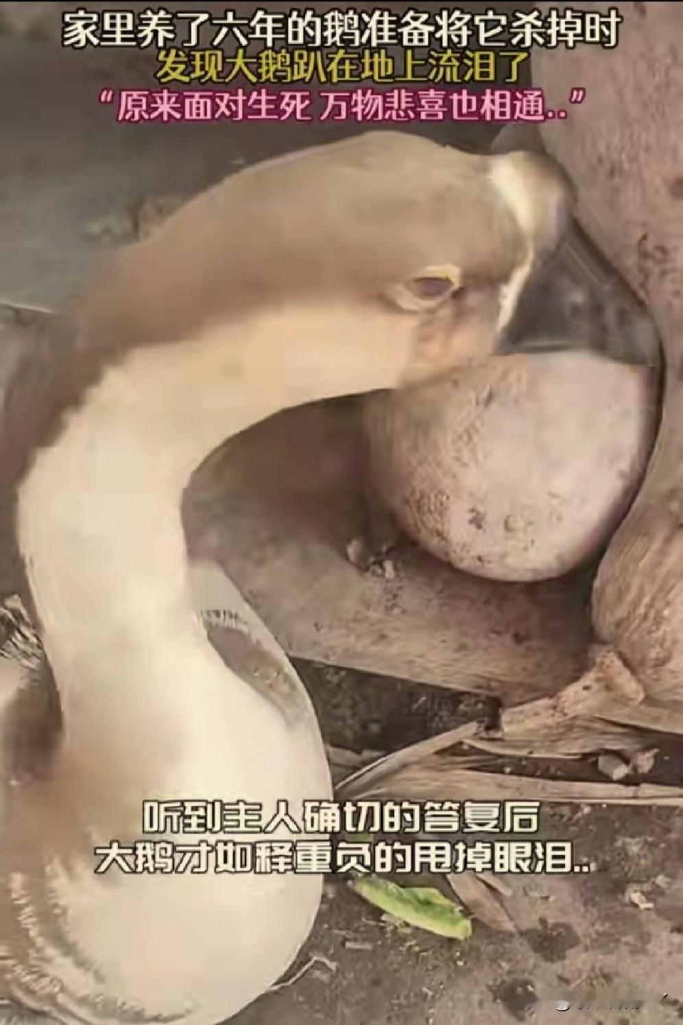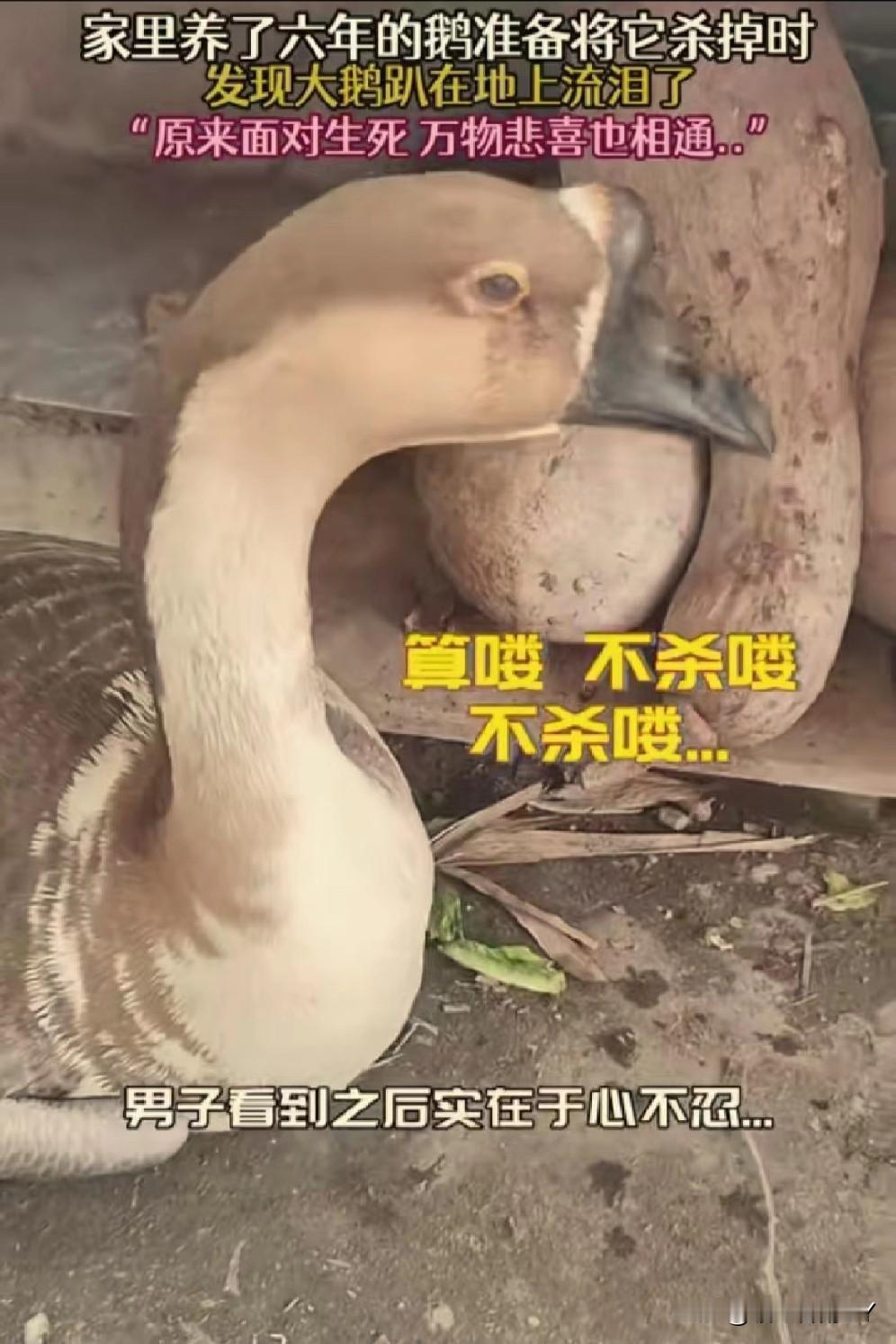 养了六年的鹅流泪了,原来万物面对生死时,悲喜竟是相通的! 家里养了六年的大鹅,在即将被宰杀时,竟趴在地上默默流泪。 它似乎已预知自己的结局,躲在角落暗自垂泪的模样,让人心中一揪。 六年的陪伴,它早已如同家人般的存在。当男子蹲下身,看到大鹅眼角的泪水,“算了,不杀了”这句话便脱口而出。 大鹅听到这话后,如释重负地甩去眼泪。那一时刻,突然领悟到了“万物悲喜相通”的深刻含意。 动物的灵性丝毫不输给人类,它们的情感纯粹而真挚。 善待每一个生命,毕竟在生死面前,我们本就相通。 大鹅