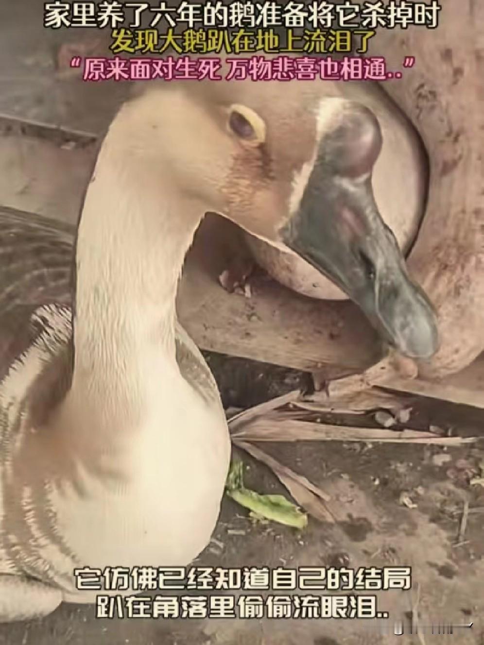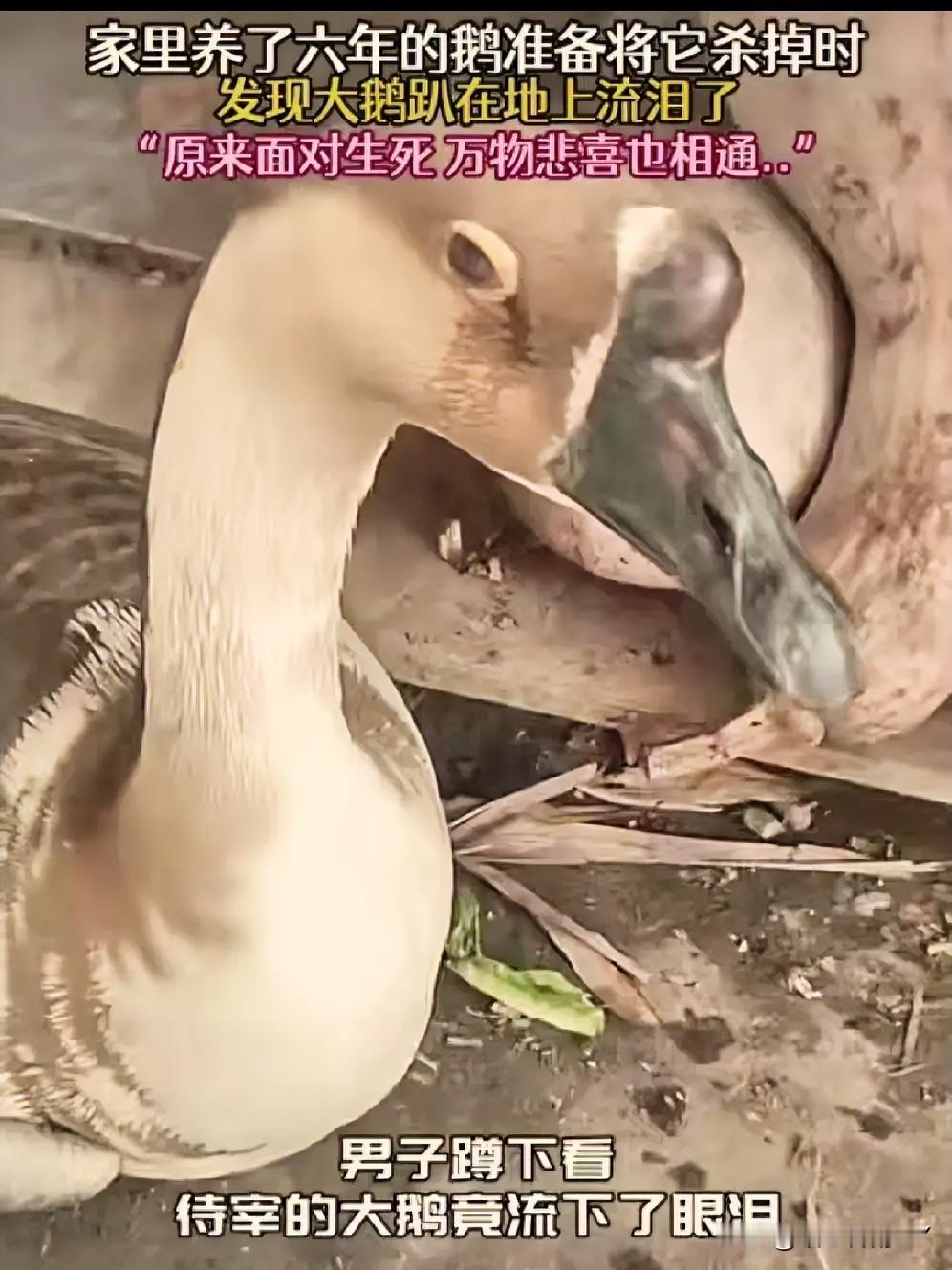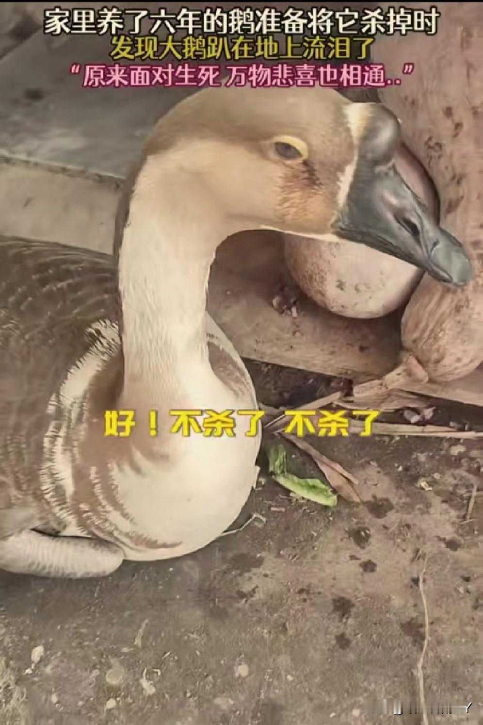 养了六年的鹅流泪了,原来万物面对生死时,悲喜竟是相通的! 家里养了六年的大鹅,在即将被宰杀时,竟趴在地上默默流泪。 它似乎已预知自己的结局,躲在角落暗自垂泪的模样,让人心中一揪。 六年的陪伴,它早已如同家人般的存在。当男子蹲下身,看到大鹅眼角的泪水,“算了,不杀了”这句话便脱口而出。 大鹅听到这话后,如释重负地甩去眼泪。那一时刻,突然领悟到了“万物悲喜相通”的深刻含意。 动物的灵性丝毫不输给人类,它们的情感纯粹而真挚。 善待每一个生命,毕竟在生死面前,我们本就相通。 大鹅