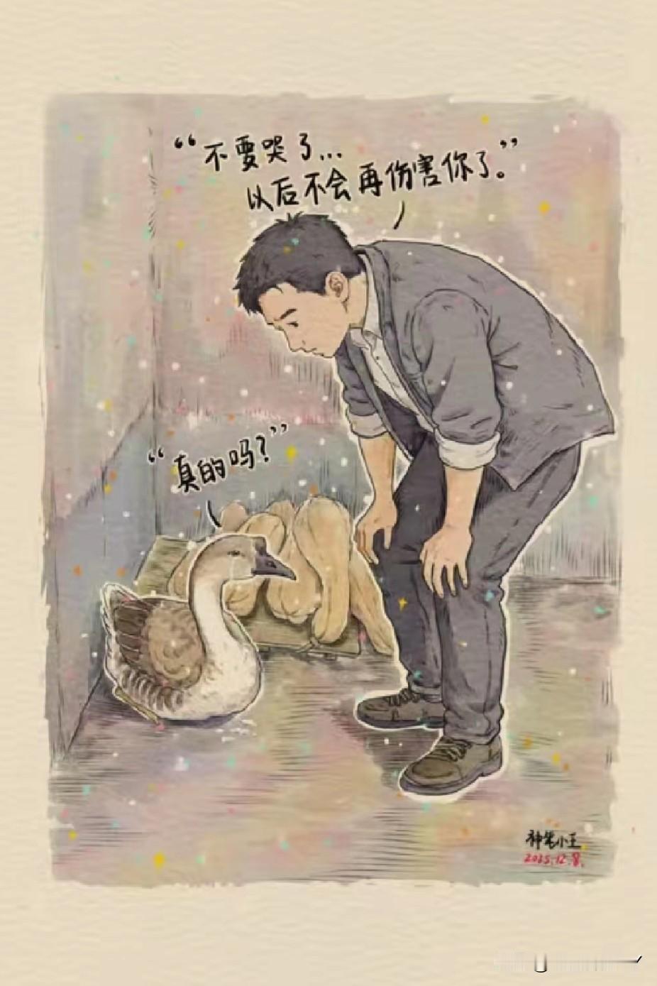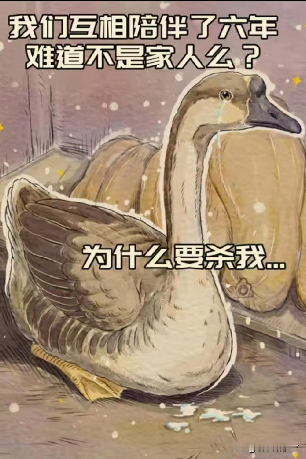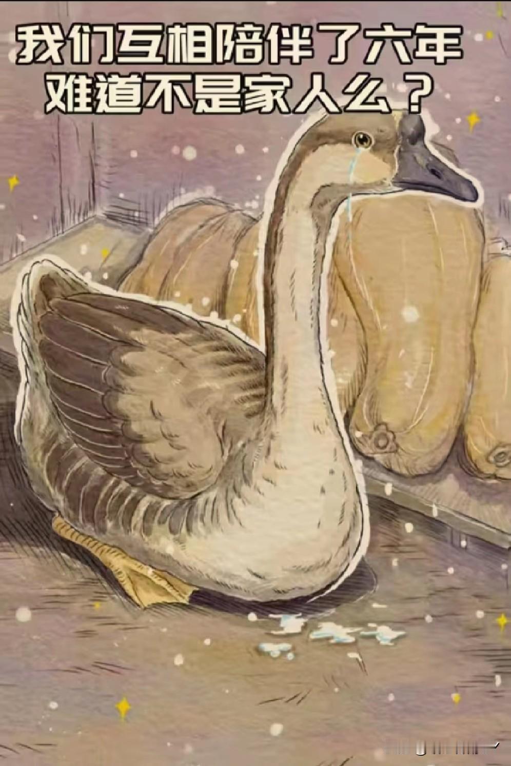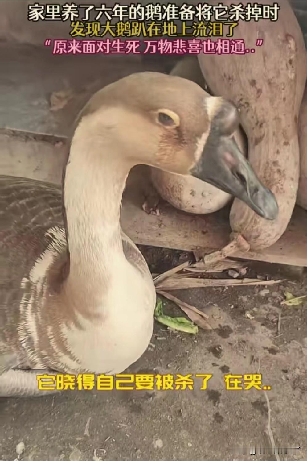 养了六年的鹅流泪了,原来万物面对生死时,悲喜竟是相通的! 家里养了六年的大鹅,在即将被宰杀时,竟趴在地上默默流泪。 它似乎已预知自己的结局,躲在角落暗自垂泪的模样,让人心中一揪。 六年的陪伴,它早已如同家人般的存在。当男子蹲下身,看到大鹅眼角的泪水,“算了,不杀了”这句话便脱口而出。 大鹅听到这话后,如释重负地甩去眼泪。那一时刻,突然领悟到了“万物悲喜相通”的深刻含意。 动物的灵性丝毫不输给人类,它们的情感纯粹而真挚。 善待每一个生命,毕竟在生死面前,我们本就相通。 大鹅