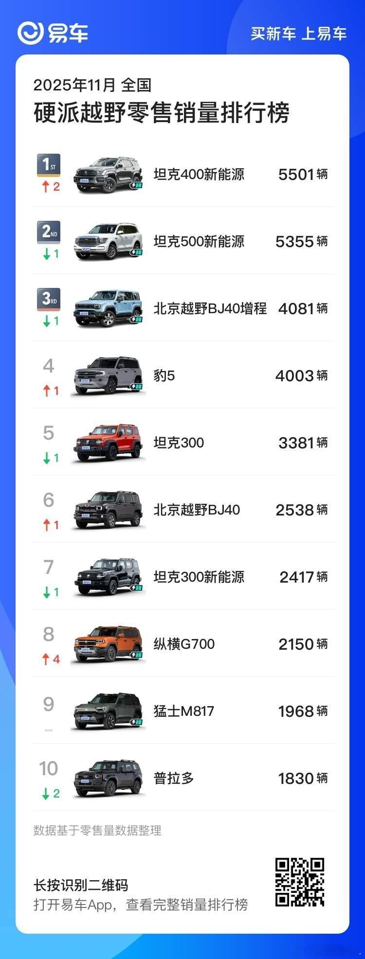 坦克手里的牌是很多的。全新坦克500和400的改款无疑是成功的。那就是外观的细微调整+智能化+冰箱彩电大沙发。下一步就是全新坦克700。现款700的问题在于动力总成单一,只有3.0的Hi4-T。新款700的外观无限接近首发限定版,非常霸气,并且增加了新的动力总成。再然后就是坦克的新车型,坦克已经很久没有新车型发布了。还有情绪价值配置的提升。比如前后整体桥的虎克版、大脚版、可拆卸车顶、无边框车门等等等等。坦克之所以慢吞吞的。根本原因我觉得还是因为竞争对手没有一个给力的。压力没给到位。
