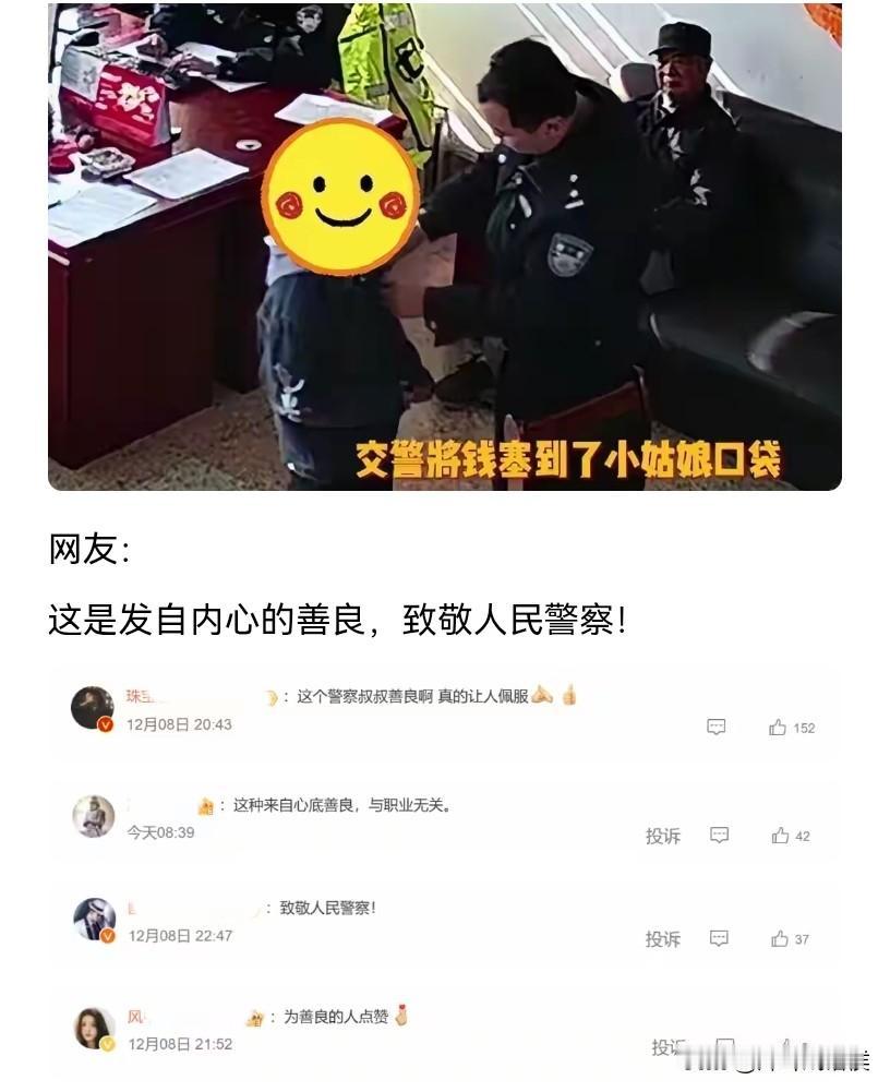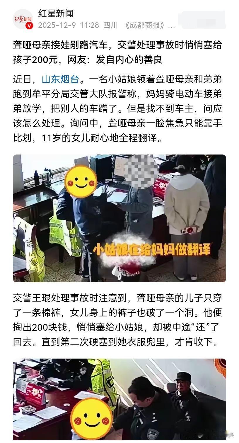 王琨,你是人民的好警察,看后让人泪流不止!近日,山东烟台一聋哑母亲接娃时刮蹭到了汽车,交警却在处理事故时,偷偷塞给孩子200元,到底发生了什么? 这则新闻虽小,却藏着人与人之间最朴素的善意和担当。 当天,一位小姑娘领着自己的聋哑母亲和弟弟来到了警局报案,称自己的母亲接自己放学的时候,一不小心刮蹭到了别人的汽车,因为找不到车主,所以就领着母亲过来了。 在问询的过程中,这位母亲因为是聋哑人,全程在比划着手势,都是她11岁的女儿在耐心翻译。事后,他们想知道,到底该怎么办? 王琨是接待这起事故的交警,他在小姑娘描述的过程中,却在认真地观察眼前的三个人,聋哑母亲的儿子只穿着单单的一条棉裤,而这位11岁的女儿,身上的裤子也破了一个洞,聋哑母亲更是穿的简简单单。 此情此景,王琨眼角有些湿润,随后掏出了200块钱,悄悄地塞给了这个11岁的小姑娘。然而,小姑娘却不肯接受,后来在王琨第2次硬塞给她时,小姑娘才勉强接受。 新闻虽小,却让人看到了人间的温暖。 聋哑母亲虽然有身体上的缺陷,说不出也听不到,但却跟孩子们一起到交警大队求助,光是“勇敢承担责任”一点,就已经折射出了她的人品。而她的行为也给两个孩子上了一堂最好的“做人课”。 交警王琨的举动,更是让人感动,他没有居高临下,也没有让人感激,而是在看见两个孩子穿着单薄的时候,知道了这个家庭的窘境,默默掏出来200块钱悄悄地塞给了孩子。 同时,11岁的女儿也不简单!全程当着翻译官,耐心帮助妈妈做翻译,交警这才得知了的事故全经过。在交警第1次塞钱的时候,她的第一反应是“还回去”。直到交警后来再次硬塞,才收下这份善意。 说实话,这就是家庭的教养! 最好的教育,从来不是说教,而是父母以身作则的模样。 一个主动担责的母亲,一个懂得体谅的交警,一个懂事自尊的孩子,他们诠释了什么才是人间值得! 世间最动人的从来不是惊天的壮举,而是藏在烟火气息的小温暖,看到这个新闻,感动之余,像是温暖了整个冬天。
