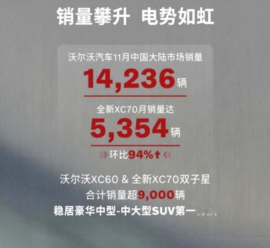 沃尔沃的新能源车现在可是越来越有存在感了! 他们家的新款XC70.刚推出两个多月,卖出去的车加起来就超过一万台了,妥妥地成了品牌增长的顶梁柱,带着沃尔沃大步迈进了电动化时代。 看看上个月的成绩单,沃尔沃在国内市场总共卖了一万四千多台车,光XC70这一款车就占了五千三百多台。 它和自家兄弟XC60一起,组成了沃尔沃的豪华SUV王牌组合! 网友真实反馈:1.看了很多车,沃尔沃服务和细节真的做的不错[呲牙] 2.行驶中直接锁死视频功能,想刷剧先停车,沃尔沃安全细节拉满[赞] 3.性能与节能,XC70全都要[赞]