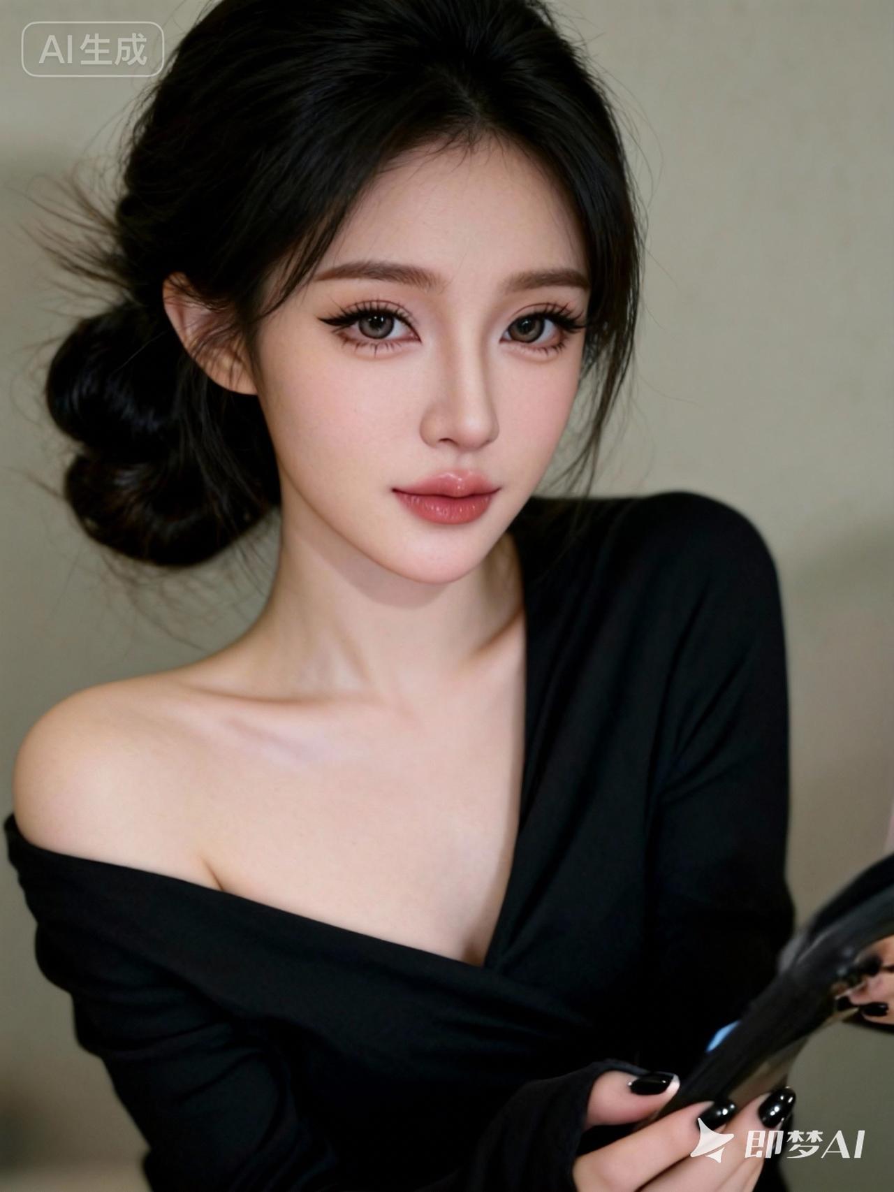 人美,黑色垂直中长发,一看就是老板娘,墨绿色一字肩大翻领,高清,蓝光,高级,高贵