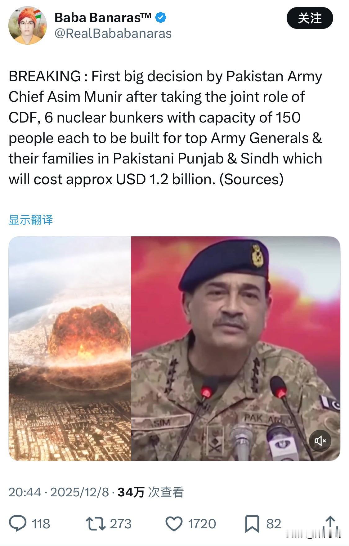 突发新闻:巴基斯坦陆军参谋长阿西姆·穆尼尔兼任国防军总司令后做出的首个重大决定,是在巴基斯坦旁遮普省和信德省为高级陆军将领及其家属建造6座核掩体,每座可容纳150人,总耗资约12亿美元。