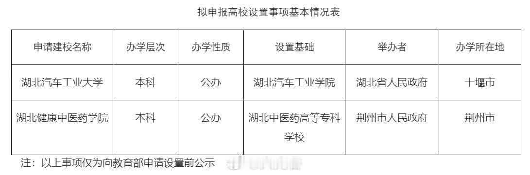 湖北拟新增两个公办本科高校! 12月8日,湖北省教育厅发布公示拟向教育部申报设置“湖北汽车工业大学”“湖北健康中医药学院”两所公办本科高校。武汉爆料 湖北汽车工业学院(Hubei University of Automotive Technology)位于湖北省十堰市,是全国唯一一所以汽车命名的以工学为主,管理学、经济学、文学、理学、法学、艺术学等多学科协调发展的全日制普通本科院校,同时也是教育部“卓越工程师教育培养计划”重点建设高校,教育部“高校新工科研究与实践项目”首批高校,湖北省“双一流”建设和博士学位授权单位立项建设高校,是国家级新工科研究与实践项目入选高校、“湖北省2011计划”牵头高校,CDIO工程教育联盟成员单位。 湖北中医药高等专科学校是2002年3月经教育部批准成立的全国第一所中医药普通专科学校,开办医类专业教育近70年历史。学校实行国家中医药管理局、湖北省卫生厅(卫计委)、荆州市人民政府三方共建的管理体制。 学校前身是创建于1953年的荆州地区初级卫生人员培训班,1958年,更名为荆州专区卫生学校,1965年,经国家高教部批准为荆州医学专科学校,1972年,更名为荆州地区卫生学校。2002年3月,经国家教育部批准,与湖北省中医药学校合并组建湖北中医药高等专科学校。 截至2024年3月,学校设有8个教学单位,拥有2所直属附院、8所非直属附属医院(临床学院)和1所省级标准化实验动物中心;设有15个高职专业。