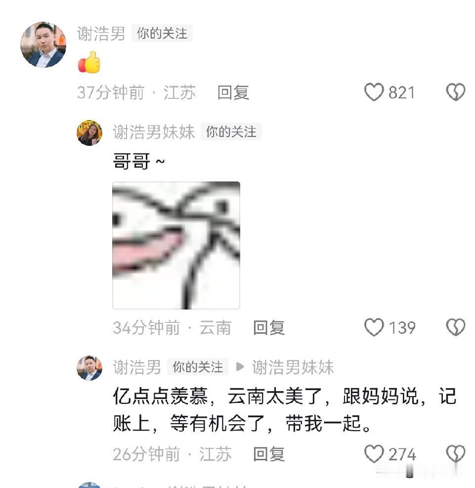 谢浩男赶来点赞了,他给大妹留言说:亿点点羡慕,云南太美了,跟妈妈说记账上,等有机