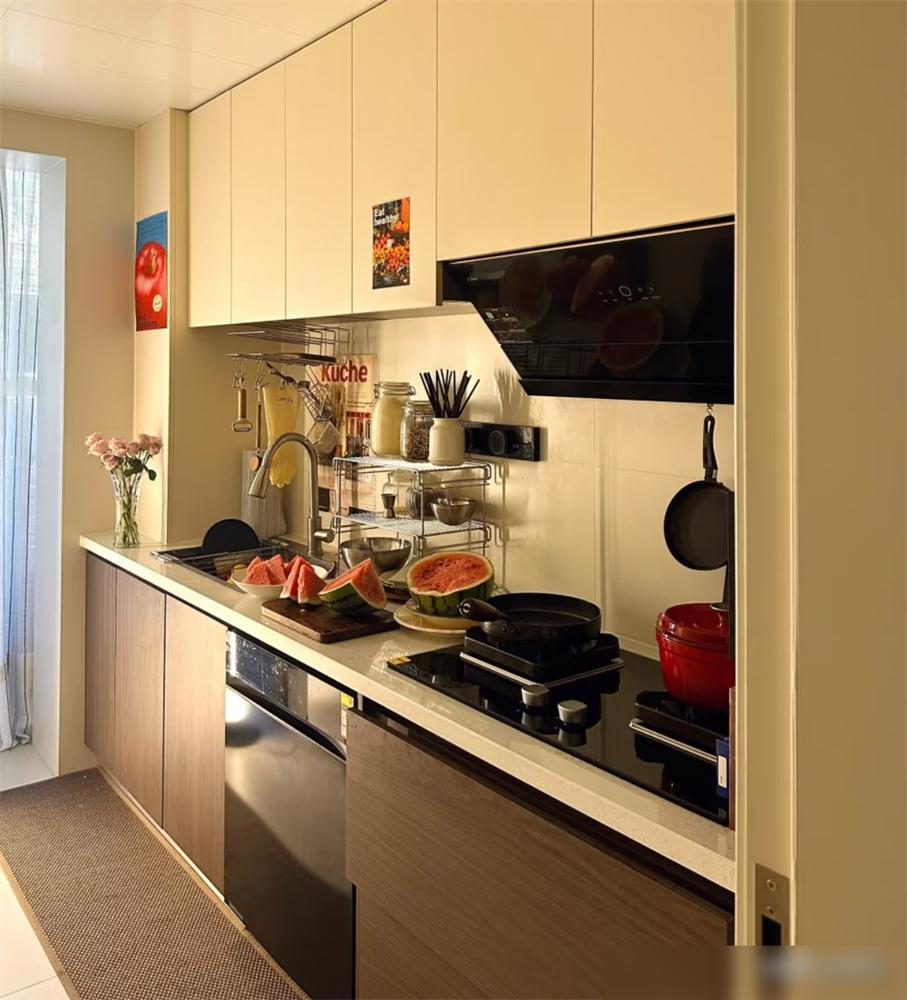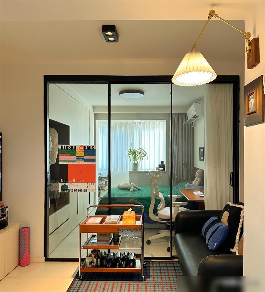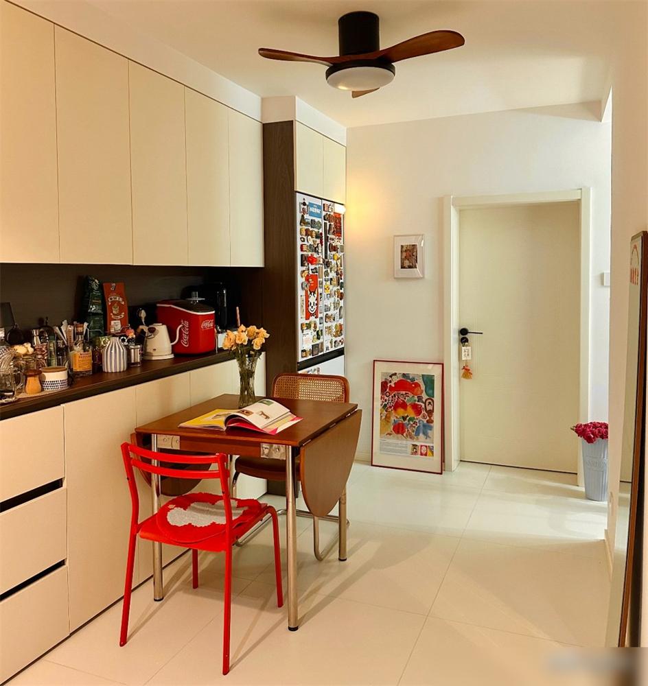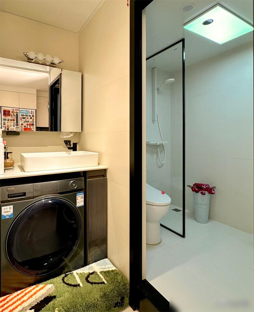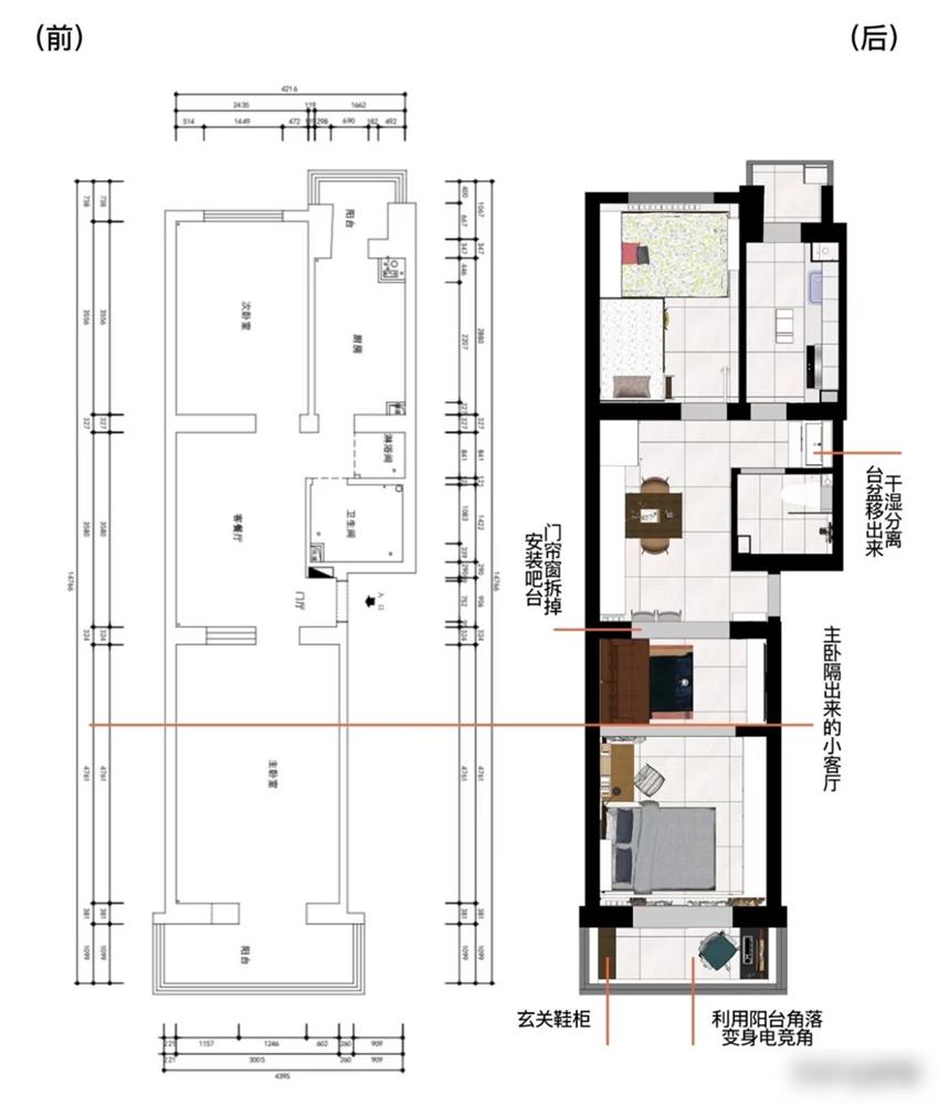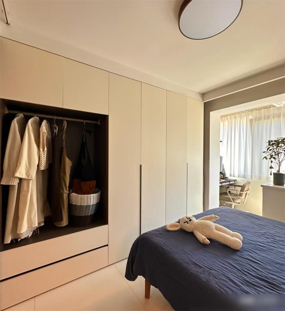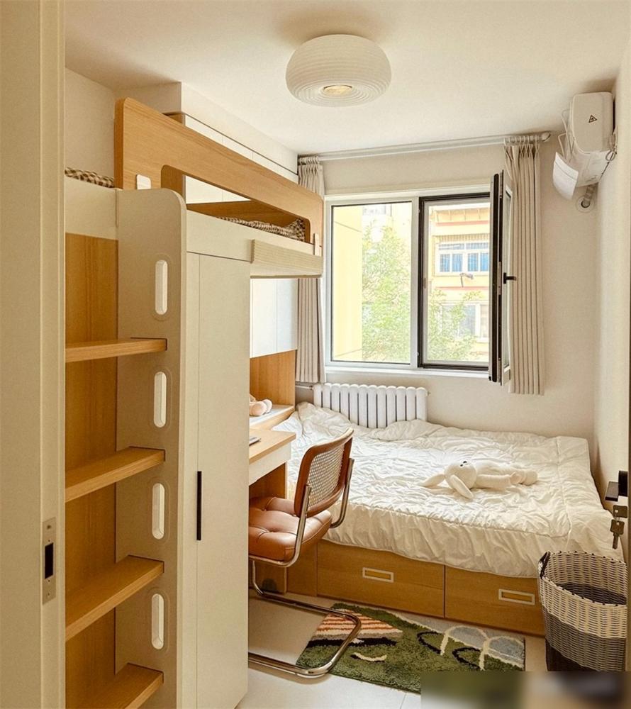 这是我见过最巧妙,最会挤的家。北京夫妻的48㎡“棒槌户型”:全屋窄似单行道,主卧切一半当客厅 🤔这户型真是头回见。又窄又长,跟个棒槌似的,从一头走到另一头像走单行道。才48平米,还是老房子,能改成这样太不容易了。 👍最绝的是把主卧给切了。原来卧室大得浪费,又窄长,住着肯定别扭。现在分出一半当客厅,整个家的功能就全了,变成了两室两厅。 🛋️客厅虽然小,但样样俱全。就放得下一张双人沙发,对面是电视墙和矮柜,一寸地方都没浪费。用玻璃门做隔断,屋里亮堂,也不憋闷。 🚪客厅另一边没做门,直接通向玄关。听说以前这里就是卧室门,现在这样分开,动静分区明确多了,比原来一大间好用。 🛏️主卧变小了反而更舒服。以前太狭长,现在方方正正的,睡觉踏实。用个纱帘和客厅隔开,隐私也有保障。 💻卧室进门地方放了张书桌。女主人在那儿办公、化妆、打游戏。桌子挨着床头,连床头柜都省了,一举两得。 👗床尾做了个大衣柜,直接顶到天花板。衣服都能收进去,还留了个开放格挂次净衣,回家外套一挂,不用老开柜门,特别方便。 ☀️阳台那儿有个承重墙垛子,就没全打通,留了半墙。可以晒太阳、喝茶,还塞下了男主人的电脑桌。晾衣服挪到厨房那边的小阳台了。 🍽️进门斜对面摆了个折叠桌。平时夫妻俩吃饭够用,小小的不占地方。来客人了打开能变椭圆大桌,挤一挤能坐六个人,椅子就收在旁边的柜子里。 🔪厨房和卫生间基本没动格局,就是翻新了一下。厨房是一字型的,柜子多,台面虽然不大,但做饭够用了。最好的是有个后阳台,能晾衣服、放杂物。 🚻卫生间没窗户,是个暗卫,但做了干湿分离。外面是洗手池,中间马桶,最里面用玻璃隔出淋浴区,洗漱洗澡上厕所互不打扰。 🧼洗衣机塞在洗手池下面,旁边还有个窄柜放洗漱用品。台面上居然还挤下个小洗衣机专门洗内衣,看着满满当当,但特别实用。 🛏️次卧没大改,就是做了个上下铺。下铺是学习桌,上铺睡觉。原来靠窗的双人床也留着,这样小小的房间能有三个睡觉的地方,以后老人来带孩子也有地方住。 💡总的来说,这个家真是把每一厘米都算到了。户型虽然奇葩,但经过这么一改造,住起来井井有条。一家三口住着,感觉挺温馨的。