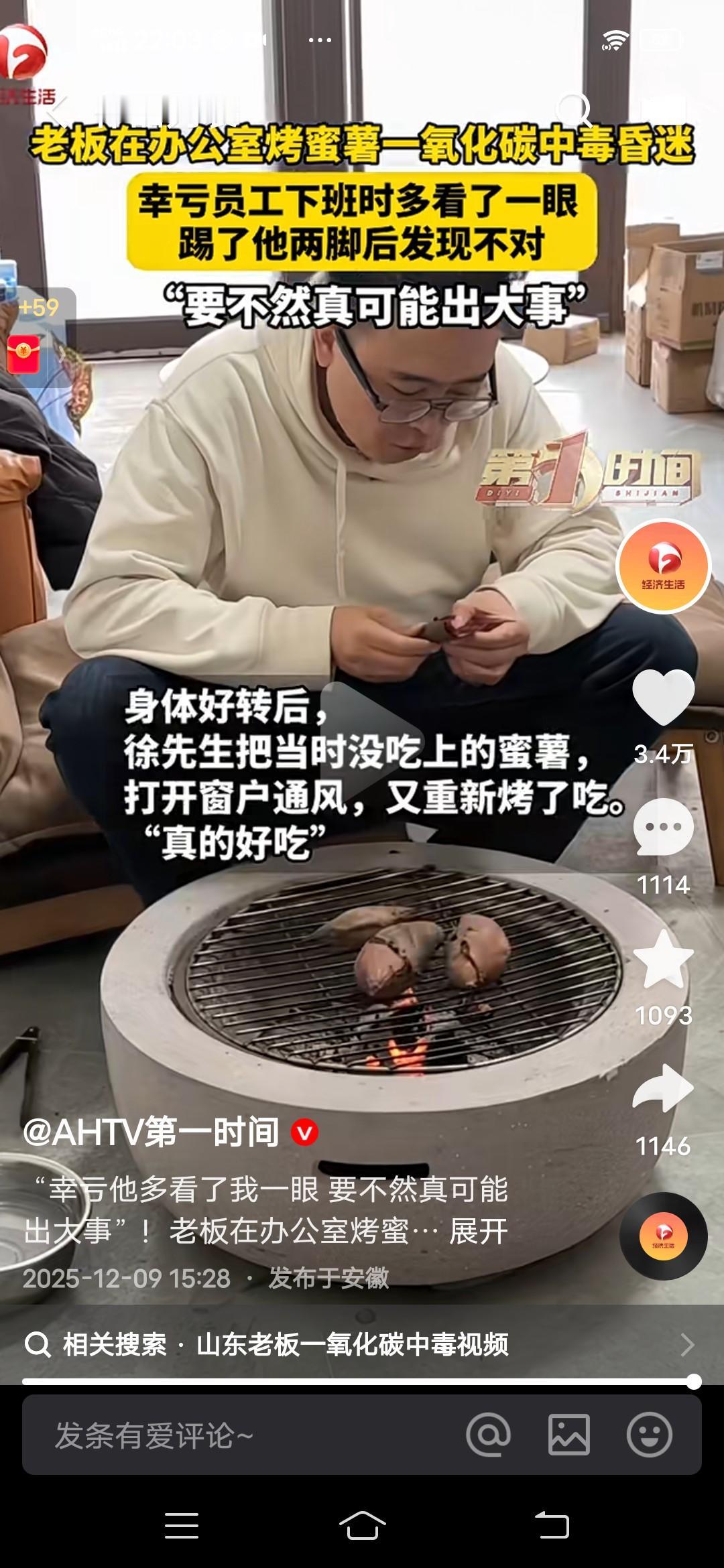 太险了,吃个红薯差点吃出人命!山东一老板,在办公室开煤气灶烤红薯,没想到,因为门窗关闭太严实,红薯还没烤熟呢,人却中煤气倒在沙发上,昏睡过去了。 所幸,没过多久,下班时间到了,有个老工人从楼上下来,经过他身边时,这工人像往常一样给他打招呼,见他不理,又用脚踢了一下,依然不见反应,工人感觉事情蹊跷,上去细看,发现出事了,这才赶紧叫了120急救。 据这老板事后介绍说,当时被叫醒后,觉得头昏沉沉的,浑身直冒虚汗,连走路都走不了直线。 因为发现及时,不久便康复出院了。 这老板真是太幸运了。一是中毒的时候正赶上下班时间到了,二是老板为人随和,所以工人才在打招呼后,见他没反应,才敢踢了一脚,也正是这一脚,才发现情况不对劲儿。 你说,这算不算也是一种因果呢?