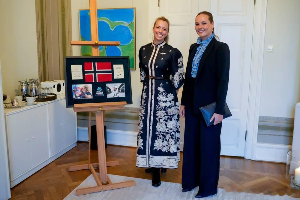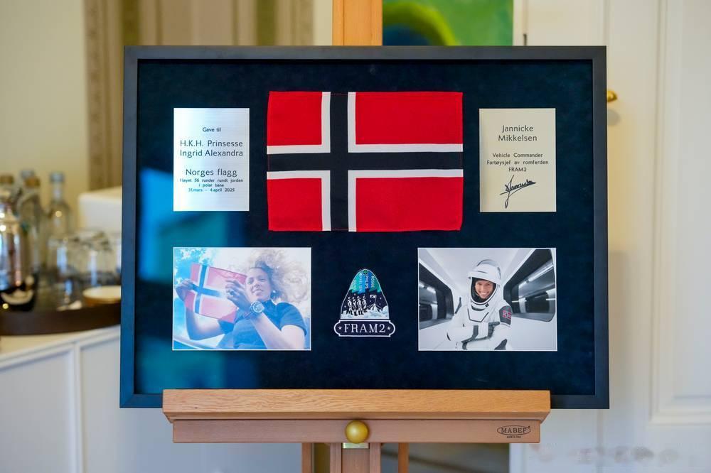 新闻 2025.12.9 挪威公主英格丽德·亚历山德拉接见挪威首位宇航员詹妮克·米克尔森,詹妮克·米克尔森把第一面伴随挪威宇航员进入太空的挪威国旗(图4)赠予给小英。