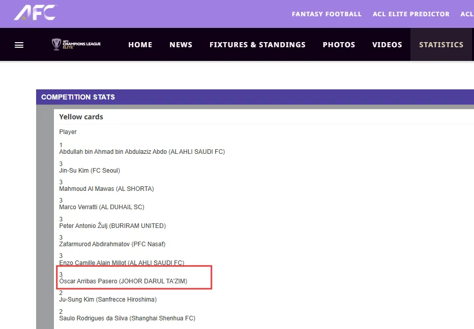 亚冠精英联赛第6轮,上海海港客场对阵柔佛DT。柔佛24号外援阿里巴斯首发出战。根据亚足联精英联赛规则,联赛阶段累计3张黄牌应该自动停赛一场。阿里巴斯在第1轮、第4轮和第5轮各吃到了一张黄牌,根据规则他无法出战海港。按照上赛季广岛三箭vs狮城水手的案例,本场比赛应该判罚柔佛0-3海港。