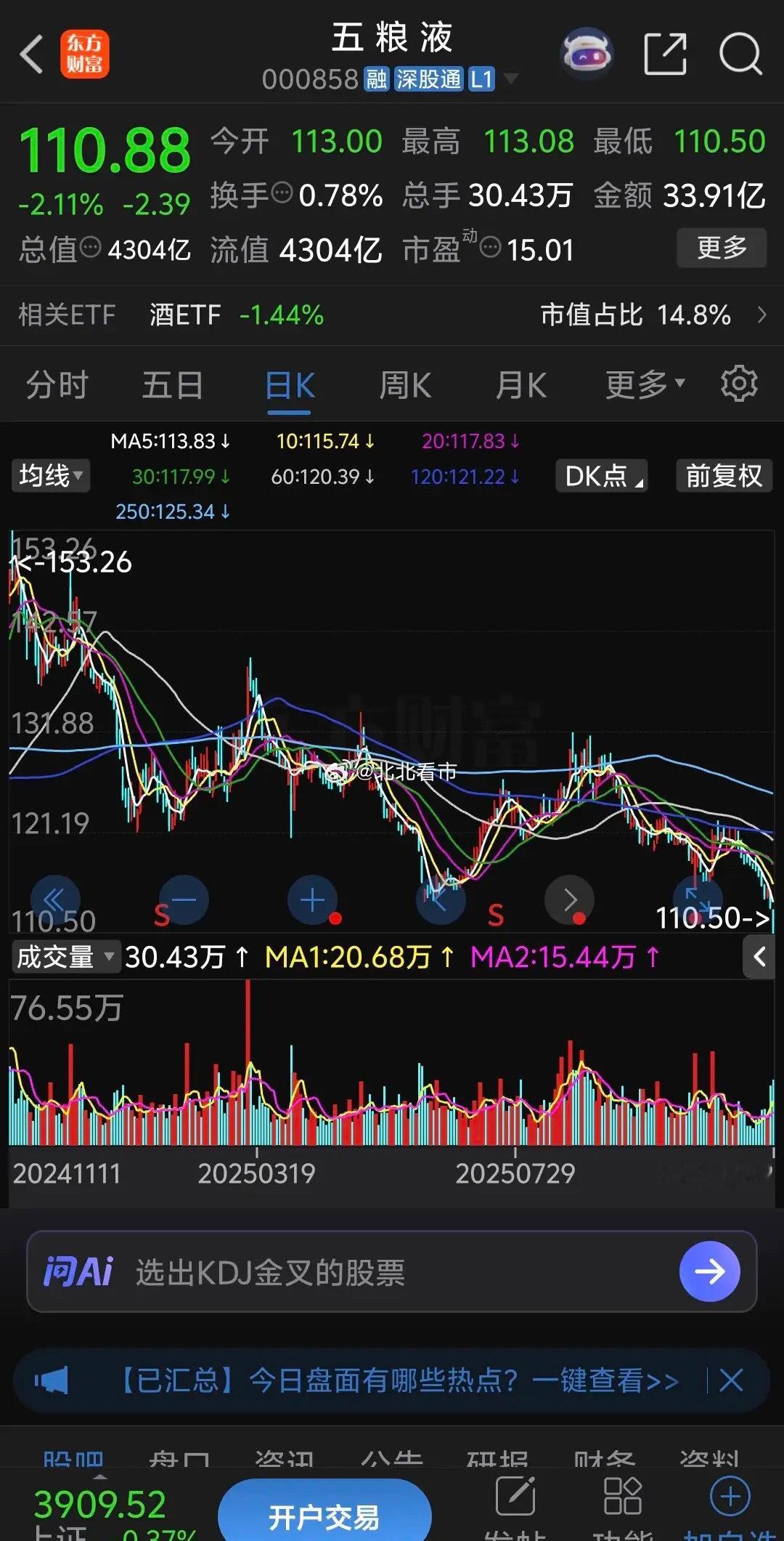 五粮液这波跌的太惨了,最近持续阴跌,这两天又加速下跌直逼110.00关口创本轮牛
