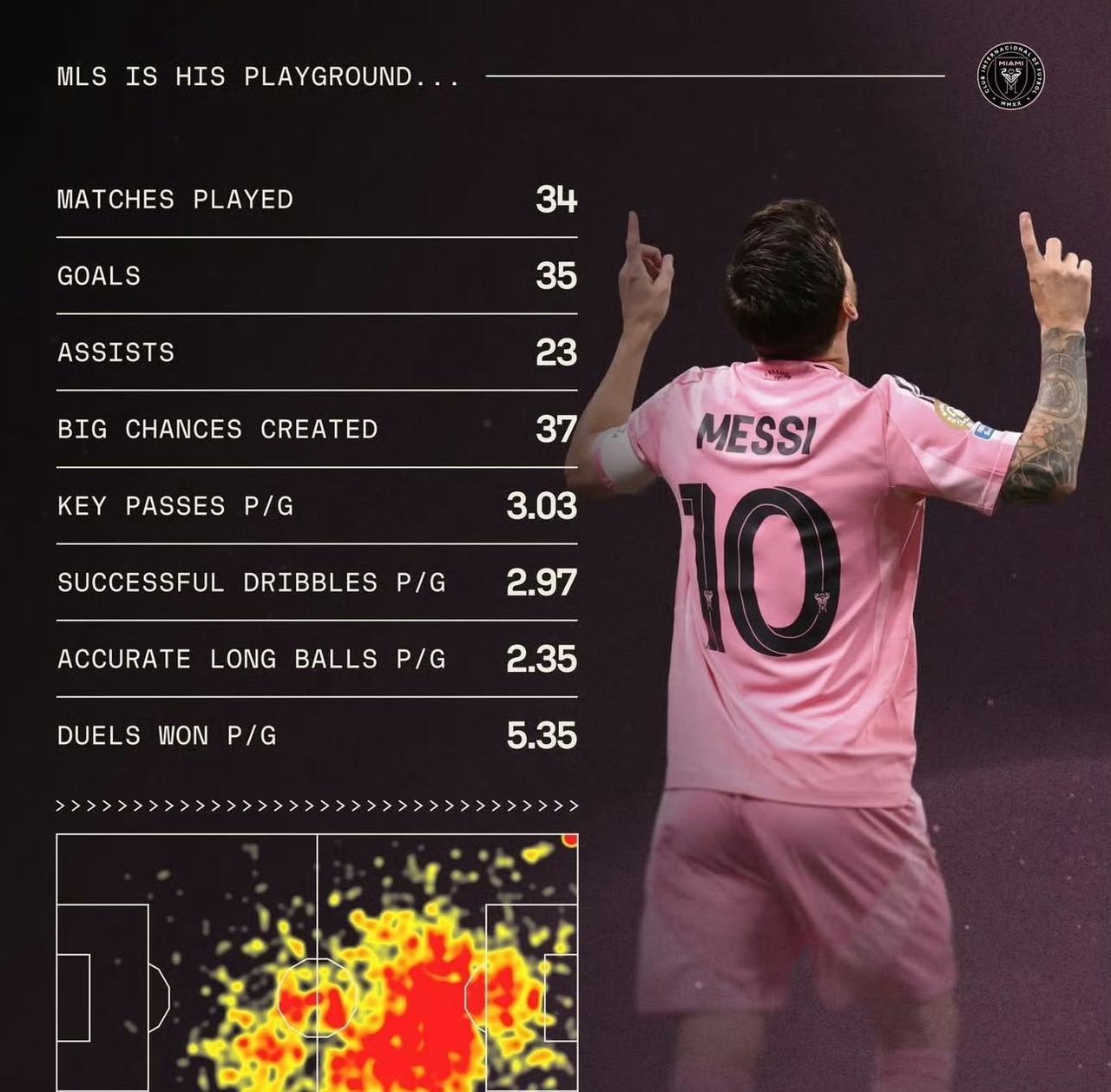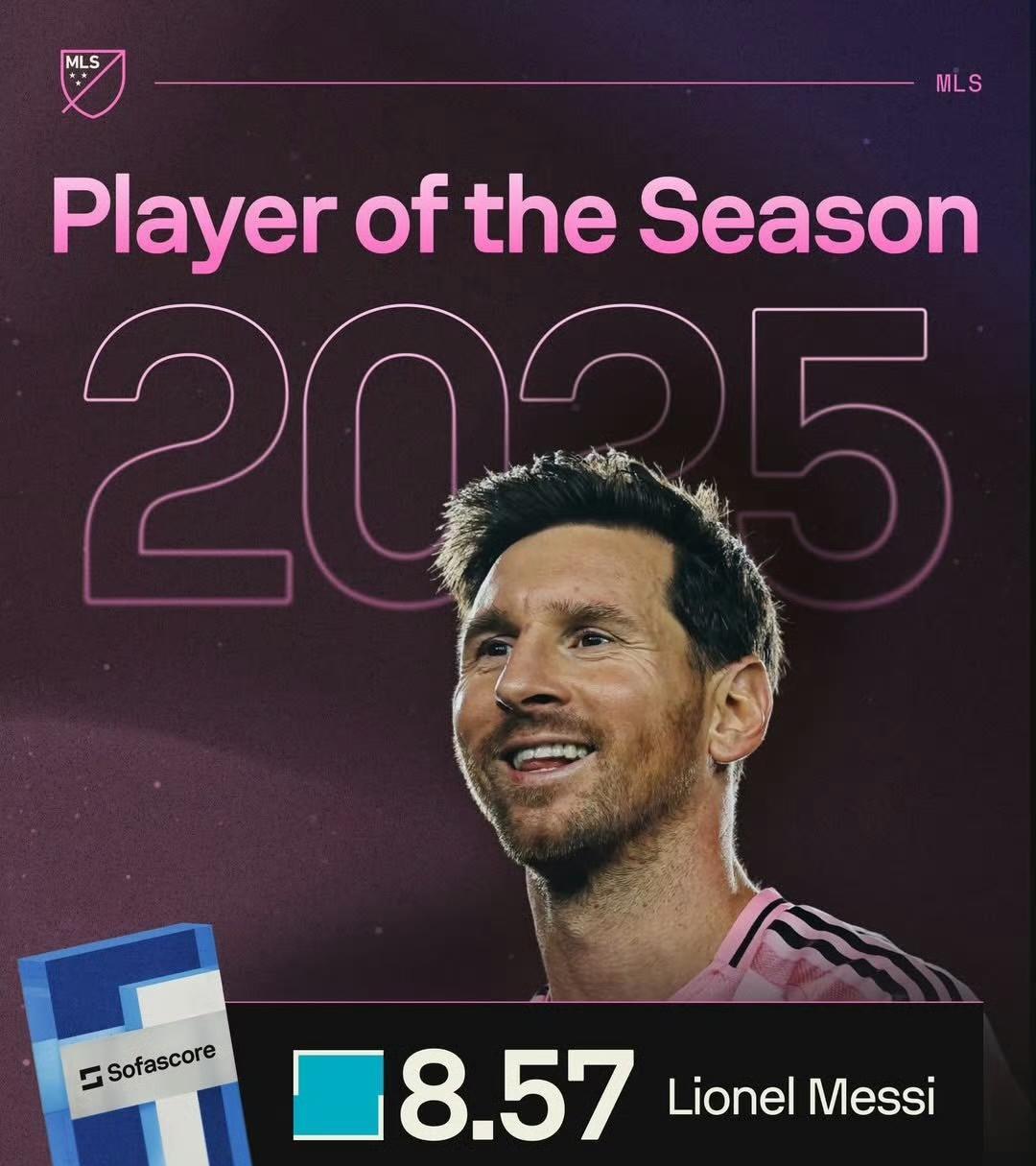 在官方颁奖之前,梅西先获得美职联2025赛季SofaScore最佳球员奖! 场均评分8.57 34场比赛 35粒进球 23次助攻 创造绝佳机会37次 场均关键传球3.03次 场均成功过人2.97次 场均精准长传2.35次 场均赢得对抗5.35次 最“令人意外”的或许是对抗之强了,其实也正常,球王踢法和中前场自由人属性是要一副好身板做本钱的,善于争球护球,才能撑得起持续不断的传球和带球。