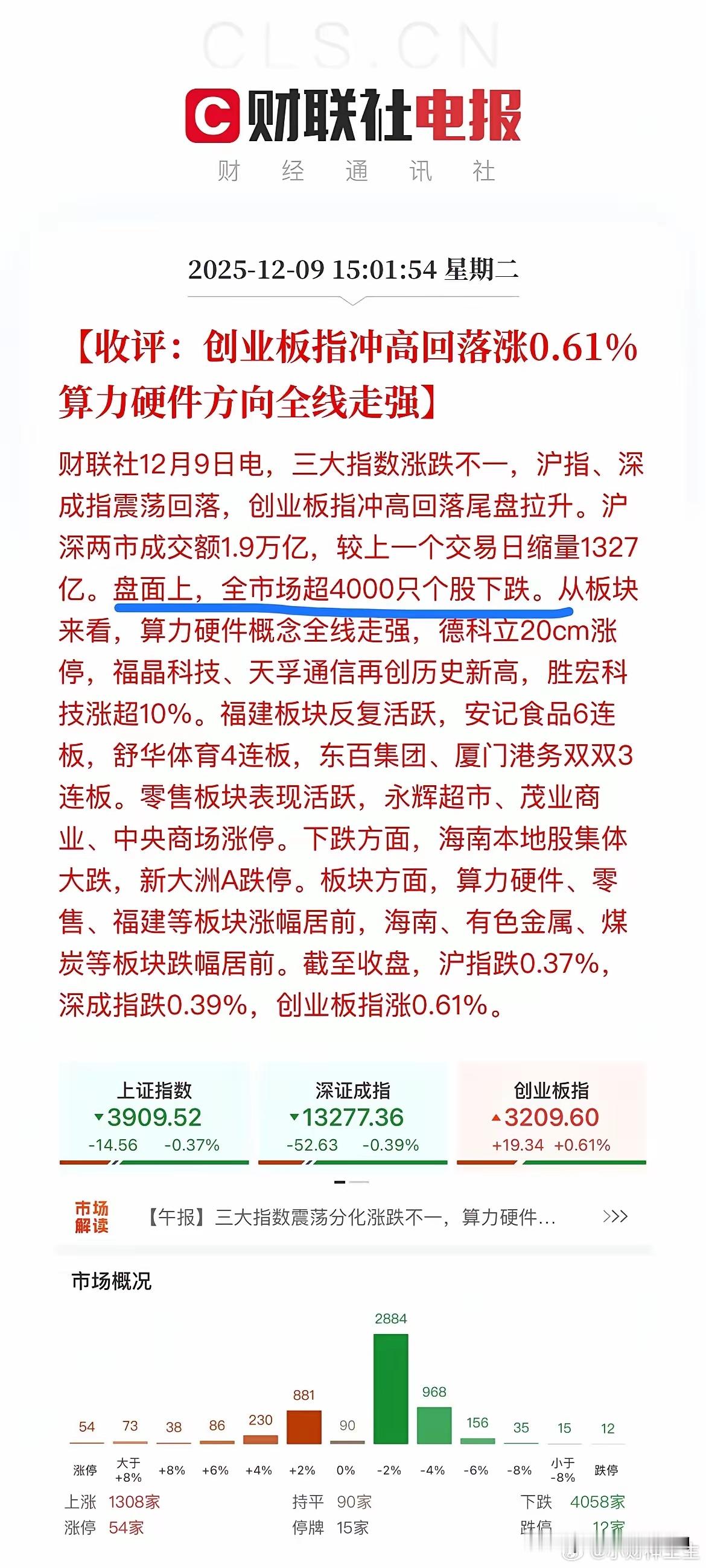 又是散户极其难受的一天!今天沪指微跌0.37%,而创业板指更是涨了0.61%,指数看起来还好,但是个股却是一片惨淡,两市仅有1308家上涨,却有超过4000家个股待涨!昨天大盘拉冒烟了也才3400家上涨,而今天随随便便跌了一下就是4000多家待涨,这盘面真的是无法用语言来描述!而今天盘面之所以如此撕裂,主要还是源于算力链的大涨!CPO总龙头中际旭创今天大涨6.32%,续创新高的同时市值已经来到了6733亿,难道说它也要冲击一下万亿市值!而PCB龙头胜宏科技则是大涨10.81%,距前高也仅一步之遥了!那么为什么它们就这么牛呢?一方面是确实是有想象空间,而且是真的有实实在在的业绩!但另一方面股东人数少可能也是重要的原因之一,比如6700亿的中际旭创最新股东人数仅有13万人,而胜宏科技也只有17万人!他们高额的股价让多数散户望而却步,而那些即便有钱但不敢追高则是又排除了一大批人,或许这就是它们能一直涨到现在的原因!所以这也是为什么我说又是散户极其难受的一天的原因,毕竟今天大涨的票散户要么不敢碰,要么买不起!