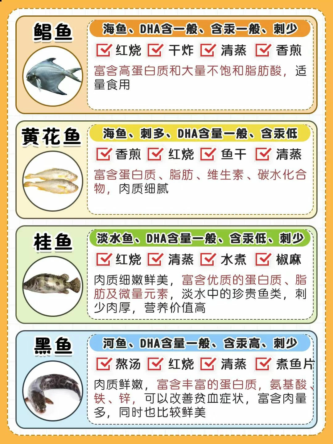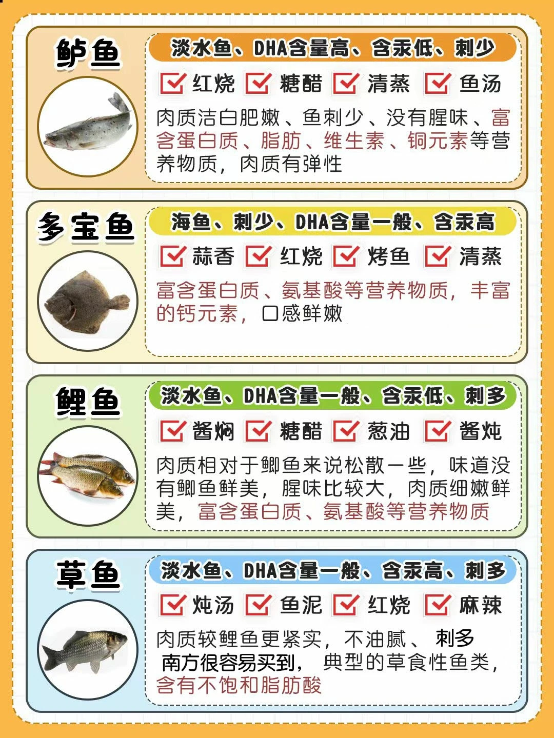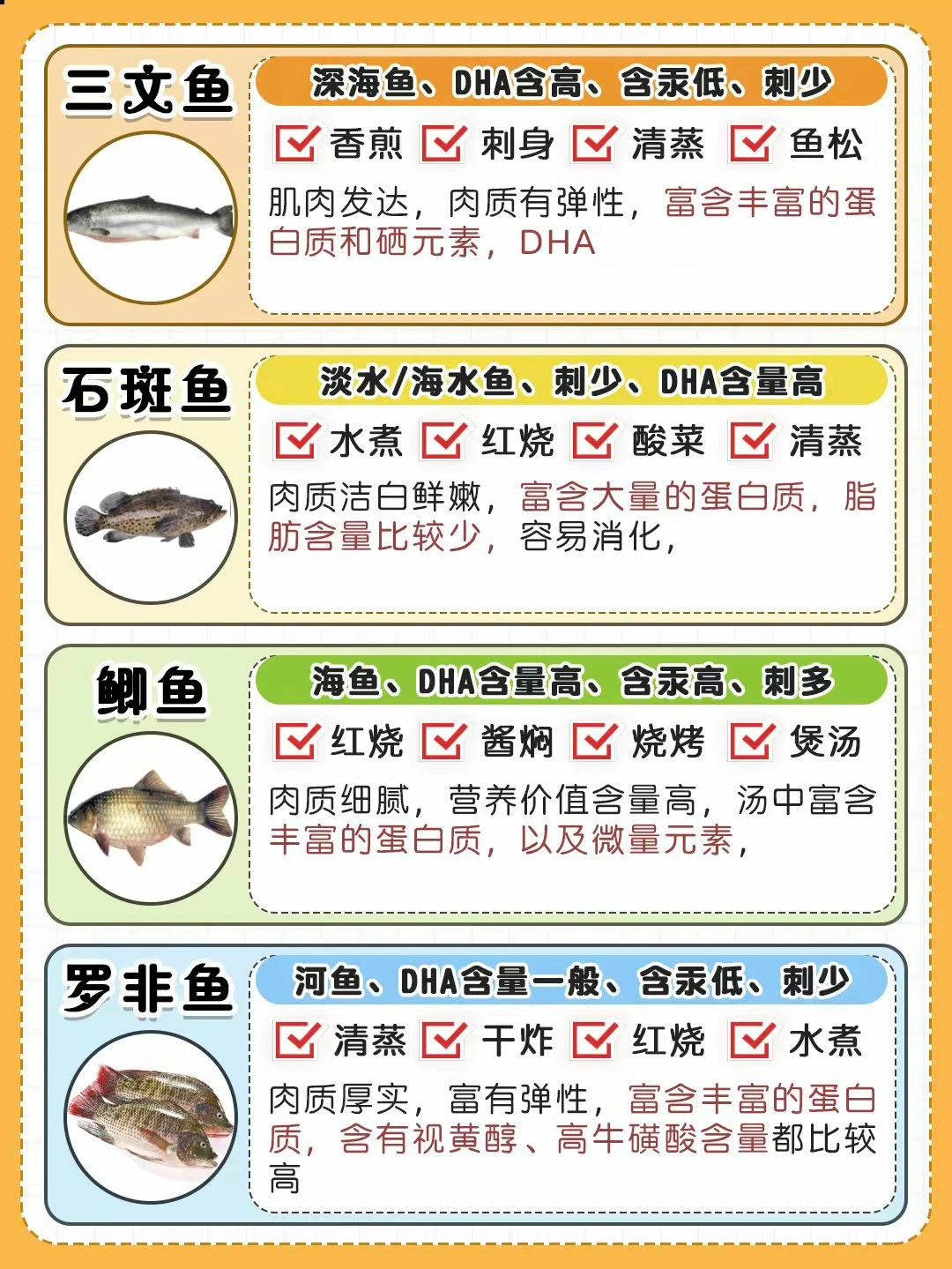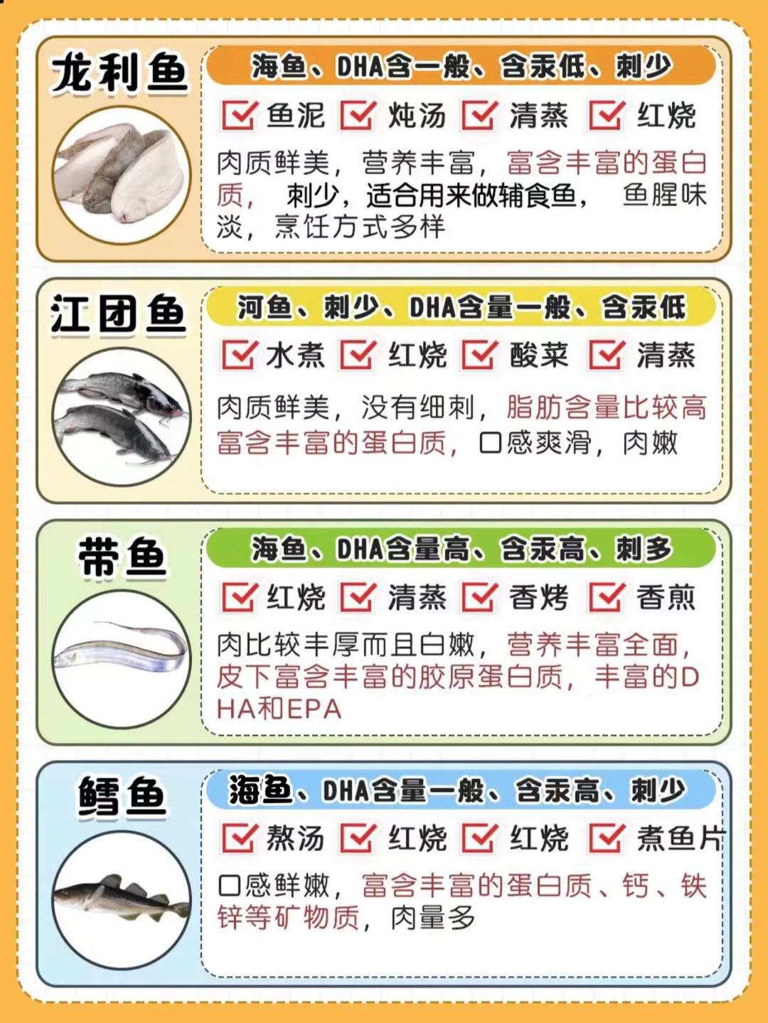 ▪️刺少:便于宝宝吞咽,不易咔喉,如三文鱼、龙利鱼等