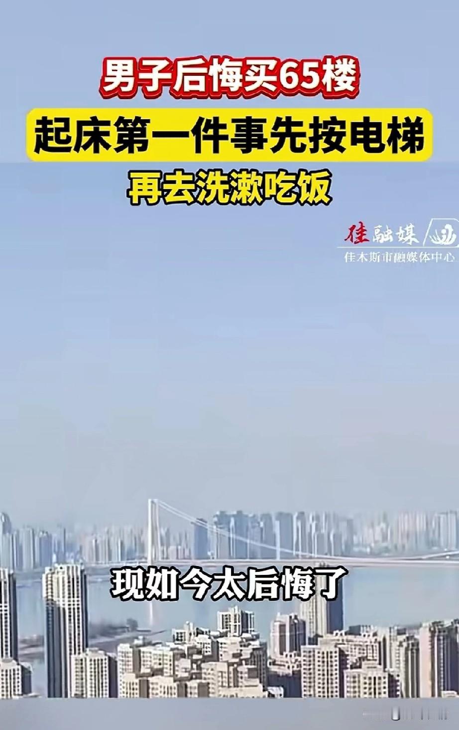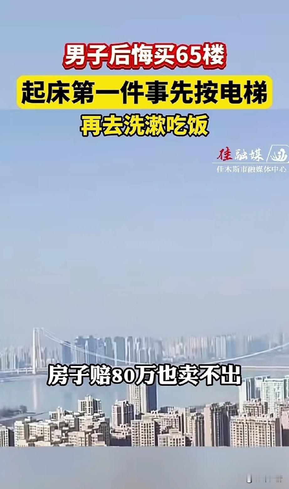 男子在佳木斯花180万买了65层的高楼, 每天起床第一件事就是去按电梯, 然后再去洗漱,吃饭, 这楼也太高了, 他买的应该是顶楼, 如今非常的后悔, 房子赔80万也卖不出去, 他表示家里面的风景不错, 可以看到城市的全景, 就是晚上睡觉的时候, 感觉楼都在晃动, 当地大风让他痛苦不堪, 睡觉都睡不好, 如今他想卖房都卖不出去, 之前看到有报道有几十层的高楼, 还可以看到云巅, 那有些连体走廊的房子, 真是苦不堪言, 尤其是刮大风的时候, 回家都是难题, 大家对于65层的高楼赔80万卖不出去怎么看? 楼市杂谈 佳木斯房产 佳木斯高层住宅 佳木斯高端住宅 佳木斯房产广告 佳木斯房价
