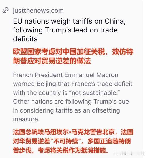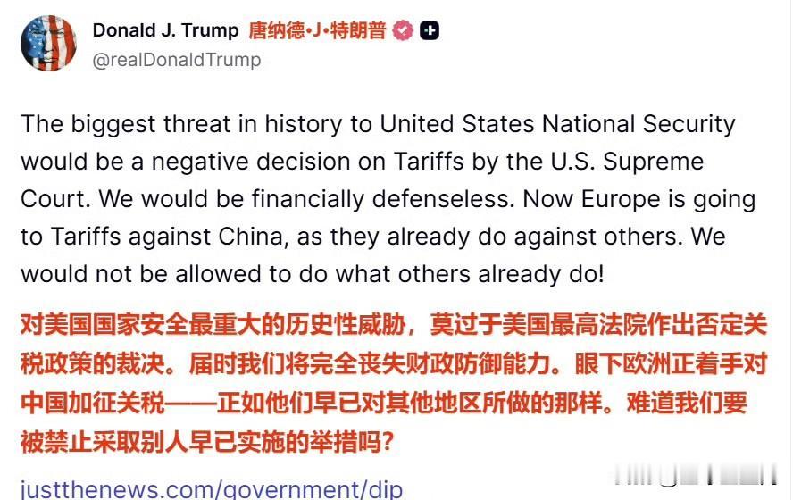 特朗普评论马克龙威胁要对中国加征关税的事情: “美国国家安全史上最大的威胁将是美国最高法院对关税做出不利裁决。我们在经济上将会毫无防御能力。现在欧洲打算对中国征收关税,就像他们已经对其他国家所做的那样。我们却不被允许做其他国家已经在做的事情!” (哟,这是找到共鸣了?)
