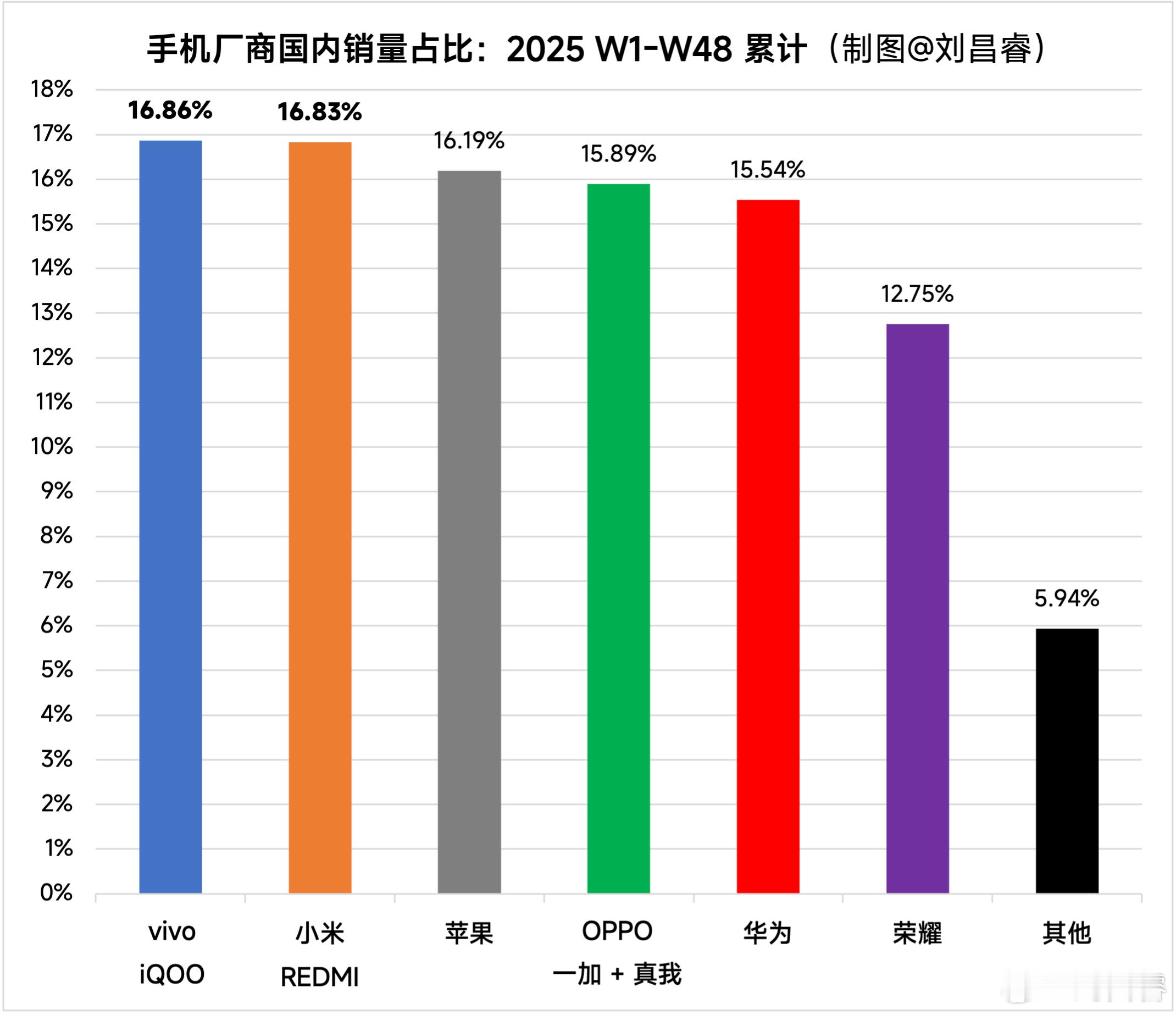 各手机厂截至 W48 销量占比,数据 蓝厂和阿米依旧是 Top2 且差距极小,年底前蓝厂还有 ,小米也有新机,两家都不能开香槟季军苹果也凭借 的热销在默默提升份额(两周涨了 0.4%)感觉年底有望突破 16.5%大家觉得今年国内手机销冠会花落谁家呢?