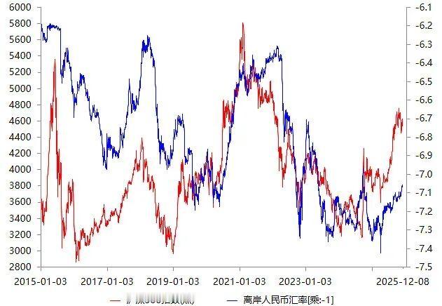 有研究表明,历次熊市都发生在人民币贬值期。 2015年三季度人民币大幅贬值,熊市开启,一直贬值到2016年底牛市前期; 2018年二季度人民币开始贬值,熊市开启,一直贬值到2019年中牛市前期; 2022年二季度人民币开始贬值,熊市开启,这轮贬值是三重底2022年末、2023年中、2024年末。 现在是人民币是新一轮升值期,过去的经验,都是越升值牛市越猛。 A股市场现在为什么这么疲软?主要是行情过于割裂,人民币升值是利好宏观顺周期的大盘股,但现在场内报团AI股,宏观现实与抱团资金的行为,不相符合。 下图是离岸人民币汇率,与沪深300指数的相关性: