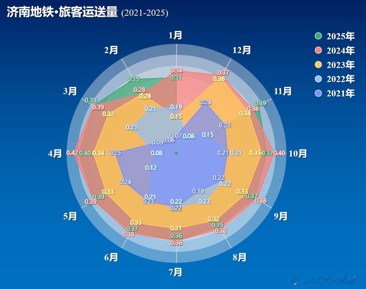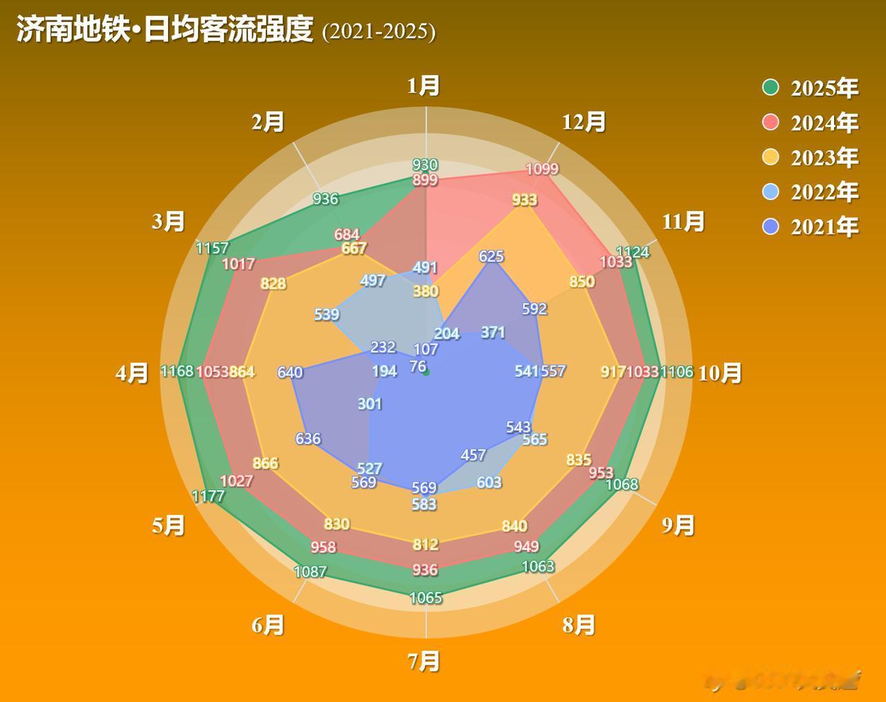 11月济南地铁完成旅客运送量1123.5w人次,同比增长8.76%,环比10月增长1.63%;日均运送旅客37.45w人次,环比增长5.02%,客流强度0.39万人次每日每公里[无辜笑][无辜笑]。11月是济南地铁“三线时代”的最后一个完整月,客流量数据应该说还是超出了预期,客流强度达到近半年最高,也算是完美收官了[惊喜][惊喜]。12月,济南将迎来轨道交通线路密集开通,预计新增轨道交通里程152km,其中地铁里程85.2km,两项数据均位居2025年全球首位[机智][机智]。目前云巴1号线已于12月6日开通,当然云巴并不计入交通运输部的轨道交通里程;4/6/8号线目前还都没有竣工验收和安全评估的消息,预计都会在12月20日后几日开通;济阳线试运行时间较晚,预计要到12月30日前后开通了[奸笑][奸笑]。按照我们预测的开通日期,12月济南地铁的全网旅客运送量将达到1800w上下,将大幅提升月客流量记录;不出意外的话12月31日全网线路将延时至0时以后运营,日客流总量有望冲击100w+;1月济南地铁将迎来“八线时代”的首个完整月,预计月客流量可以达到2500w量级[吃瓜群众][吃瓜群众]