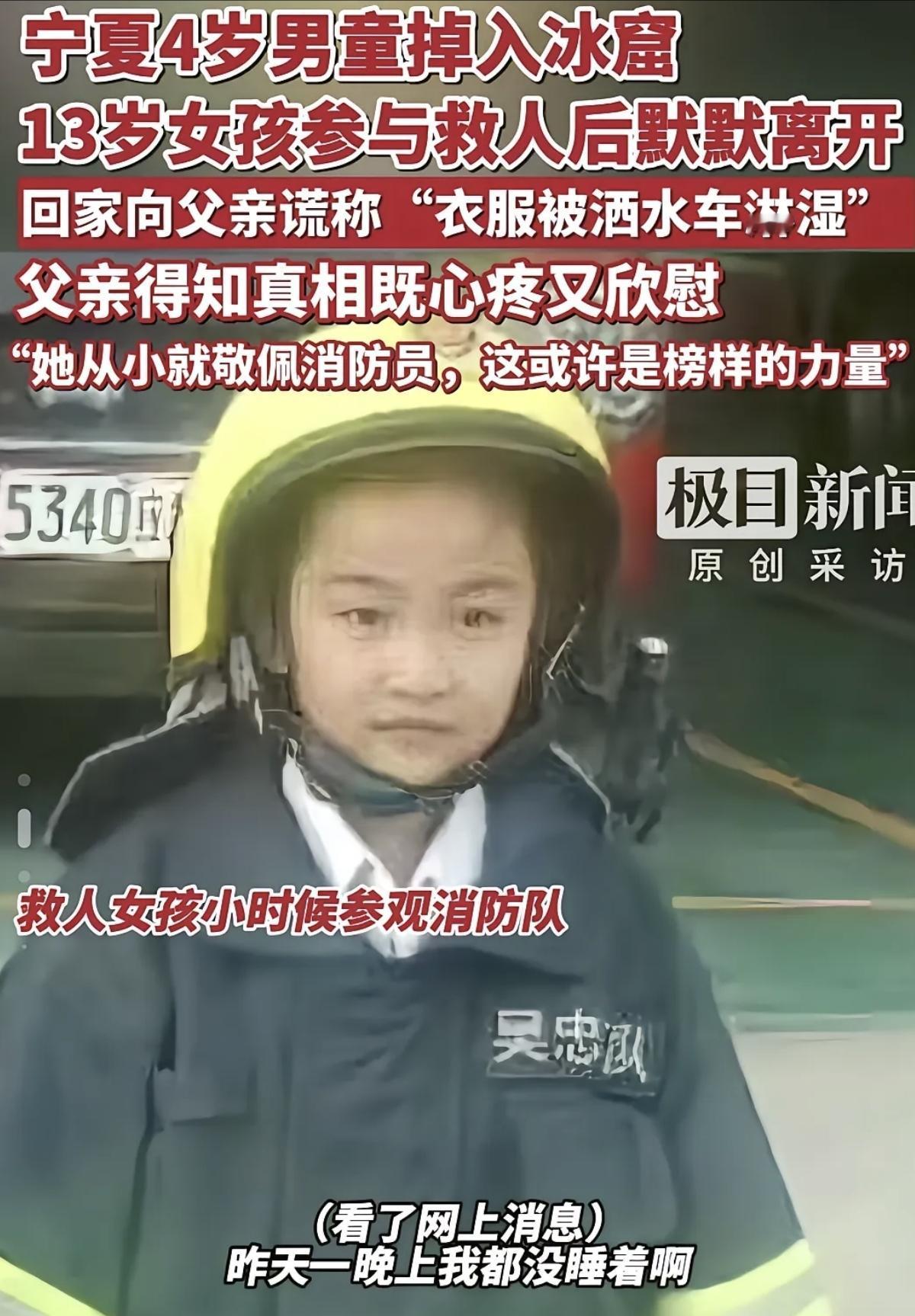 榜样的力量!宁夏那个去冰窟窿救人的女孩火遍了全网,至于为什么敢去冰窟窿救人,看了这张照片就大家明白了!这张照片是她小时候去参观消防队时拍的,她站在救援车前,头戴安全帽,身穿救援服,只是那个时候她瘦小的身体还不能撑起这身衣服!直到现在她也还很瘦,不过榜样的力量早已在她心中生根发芽,让她瘦小的身躯里蕴藏着着巨大的能量! 初一的小女生冰窟窿救人,这一切本就有着巨大的风险,但是女孩还是去做了,就请把最高的敬意,奖励,赞美全都致以她!相信她的未来一定大有可为! 麻烦看官老师们右上角点击一下“关注”,既方便您进行讨论和分享,又能给您带来不一样的参与感,感谢您的支持!