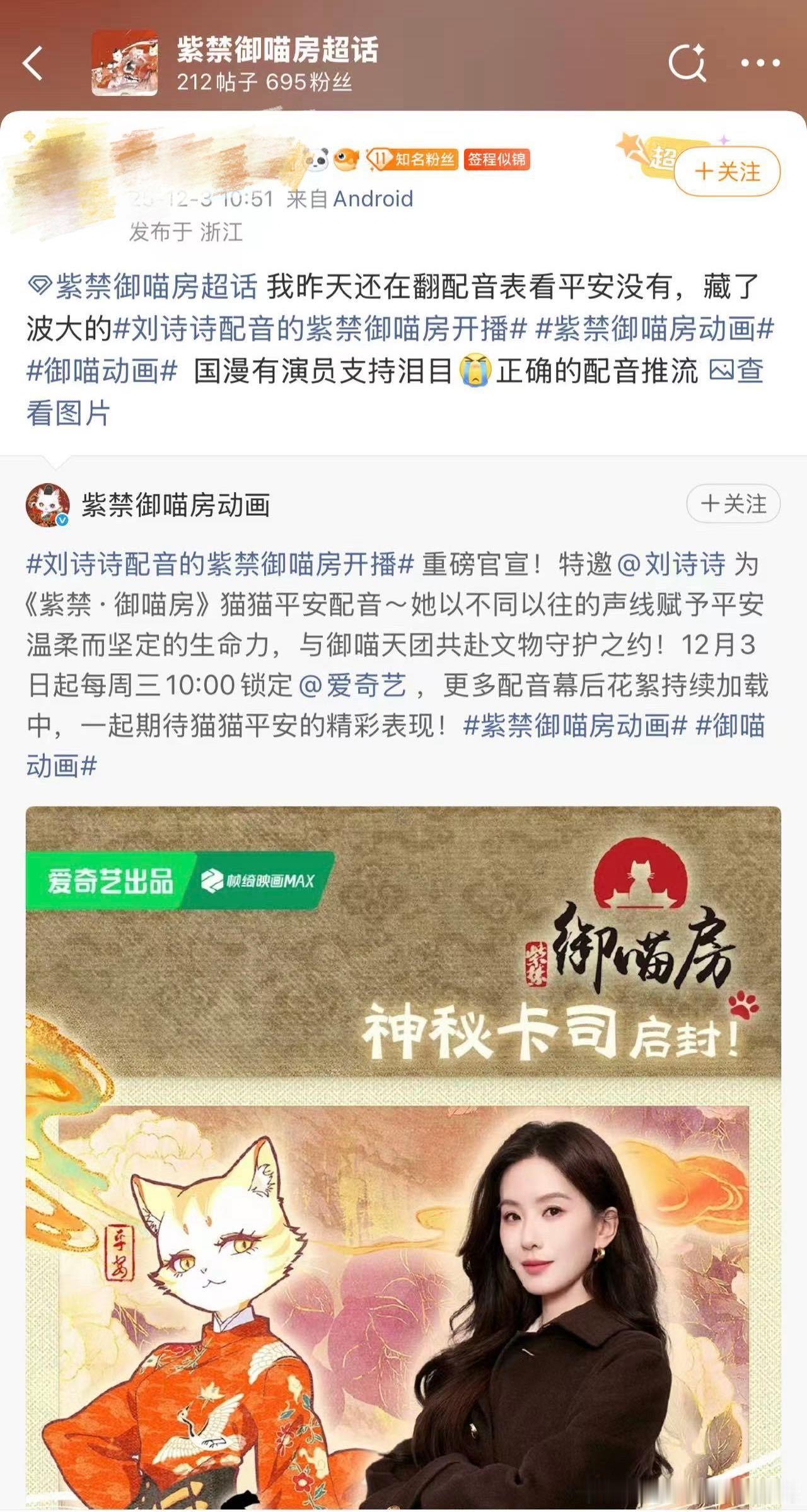 刘诗诗参与配音《紫禁·御喵房》,声线贴合角色广受好评