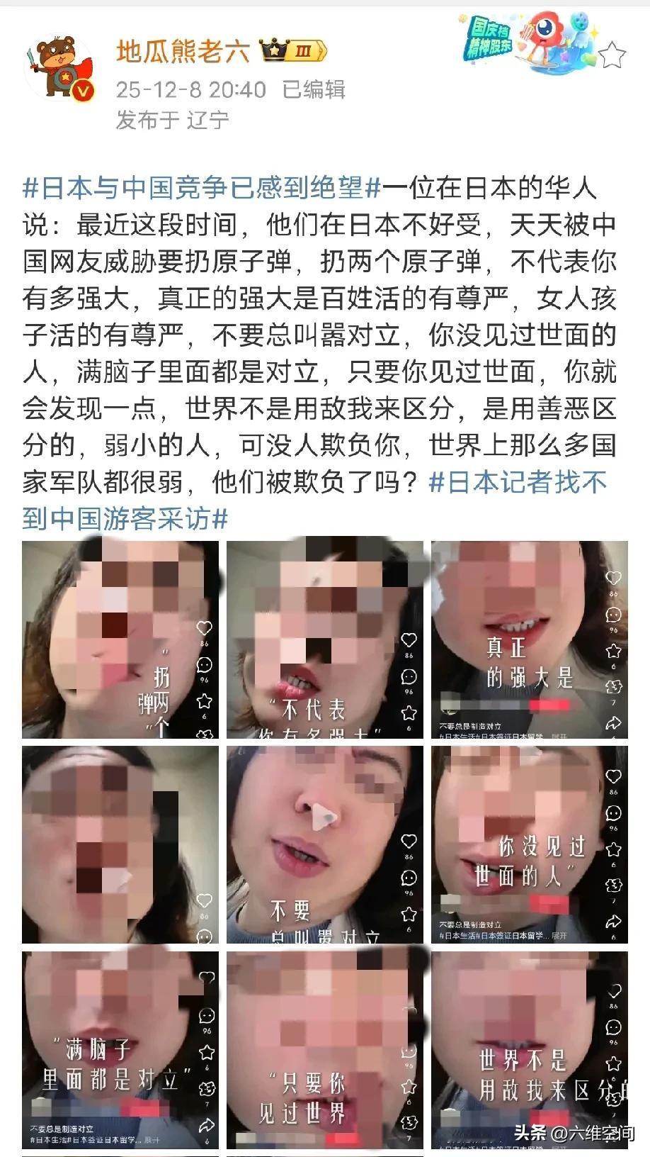 一个日本华人不去教育日本右翼,反而跑来中国的社交媒体上教育中国人,说什么能扔两颗原子弹不代表你有多强! 我觉得如果日本华人都是这个样子,反而是好事,到时候也不需要有太多顾虑了,反正该提醒的已经提醒了,该说的道理都说了,你自己愿意待在日本的,到时候就别求着国内帮你们了,精日到这种地步,也是它们活该!