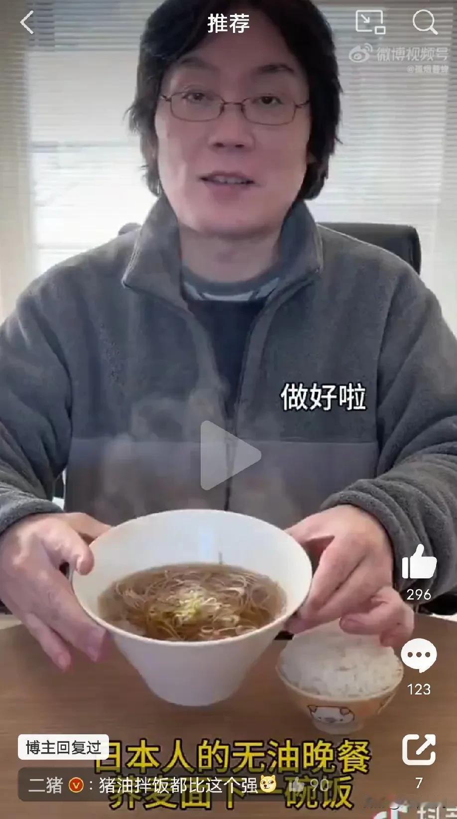 一个日本博主展示他的无油晚餐,就小碗荞麦面烫熟,加点盐,然后再配一小碗米饭,然后就吃饱了,发达国家也不过如此,老百姓吃饭都成了这个穷酸样,东西贵吃不起,还美其名曰是健康晚餐,只喝水不吃东西,岂不是更健康,人正常就是需要荤素搭配,各种营养才能均衡,这种吃法纯粹是折磨自己,但是日本人没办法,因为物价贵,只能减少饭量,尽量吃得简单,再这样搞几年下去,日本将是第一老百姓普遍营养不良的发达国家!