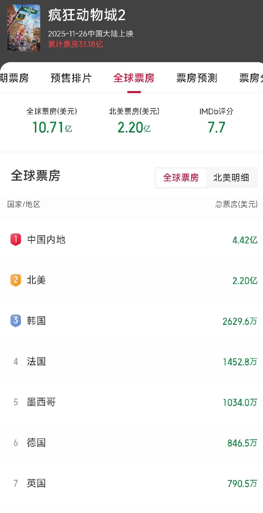 《疯狂动物城2》中国票房表现让好莱坞彻底慌了! 这部动画在内地狂揽31.18亿人民币(约4.42亿美元),不仅是北美2.20亿票房的2倍,更让中国首次成为好莱坞大片的“全球第一票仓”——全球10.71亿总票房里,中国占了近42%。单日7.38亿的成绩,甚至打破《复联4》垄断6年的进口片纪录,影院临时扩招员工、衍生品被抢空的盛况,让冷清的院线秒回春节档。 放在好莱坞对华票房缩水70%的背景里,这组数据更扎眼:今年此前的好莱坞大片《侏罗纪世界:新生代》中国票房仅5.67亿,而《疯狂动物城2》直接把进口片天花板抬到40亿级别。外媒集体惊呼“破纪录”,Reddit上北美网友酸言酸语:“中国一天票房抵我们一部超英片总收入”。 更让好莱坞慌的是“权力转移”:过去北美市场决定影片生死,如今《疯狂动物城2》的成败,要看中国观众买不买账。迪士尼CEO飞赴上海站台、片尾彩蛋埋东方元素,本质是在认账——中国不再是“海外补充”,而是必须讨好的“关键战场”。 毕竟他们清楚:不是中国市场不行了,是平庸的好莱坞片不行了。而《疯狂动物城2》的爆火,不过是给所有投机者上了一课:想赚中国的钱,先拿出配得上中国审美的诚意。