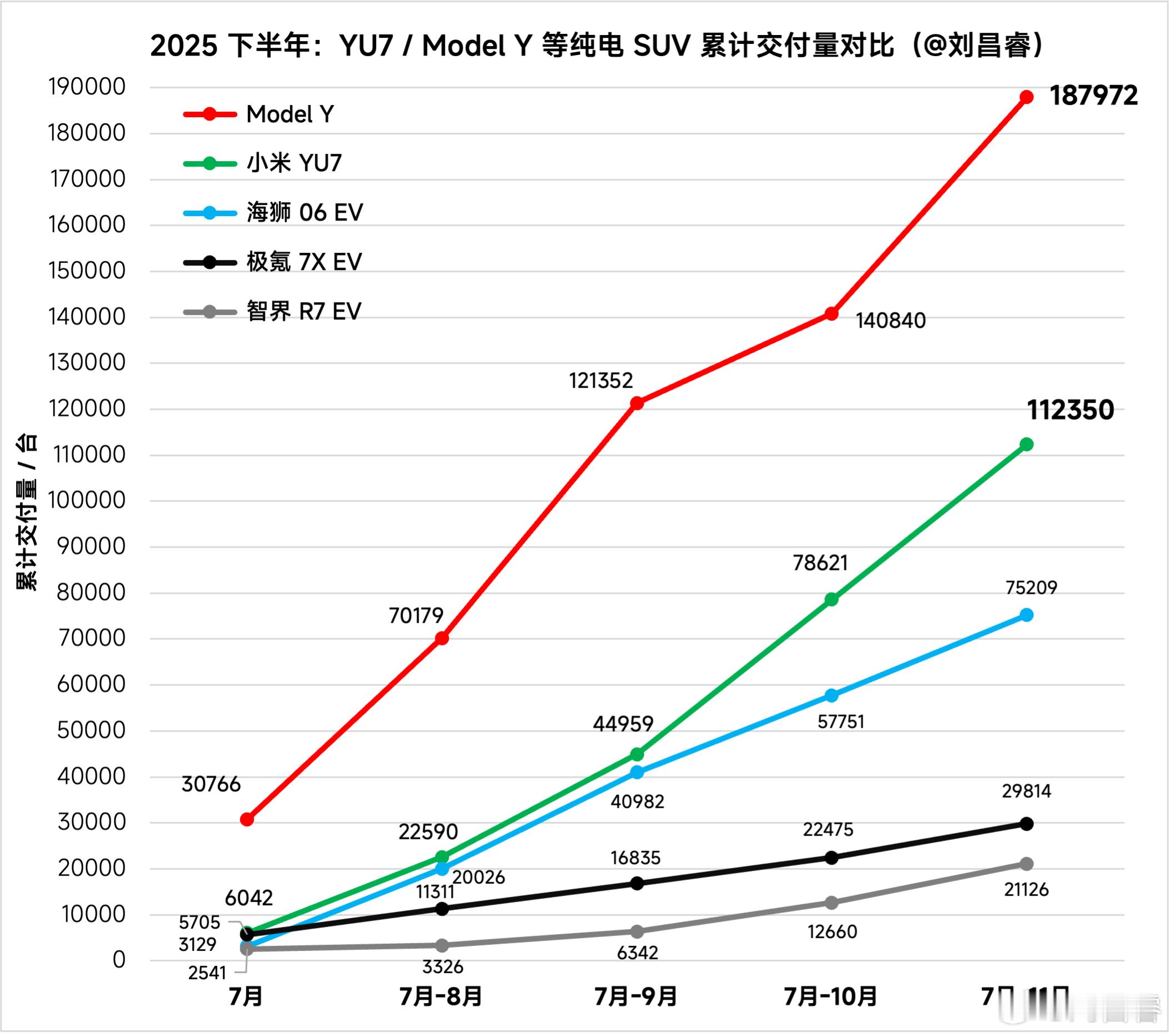11 月汽车销量具体数字来了! 交付 33729 辆,环比小涨,拿到 SUV 总榜亚军(很可惜没超 ,MY 居然有 4.7 万)我也更新了纯电 SUV 累计销量图(图2)Model Y 可以提前开香槟庆祝下半年销冠了,YU7 亚军应该也稳但假如只看 Q4,YU7 前两个月之和仍领先 MY 几百台,希望 12 月给力,YU7 能拿到 SUV 季度销冠另外 SUV 榜前十有 3 款比亚迪,迪子还是很强的