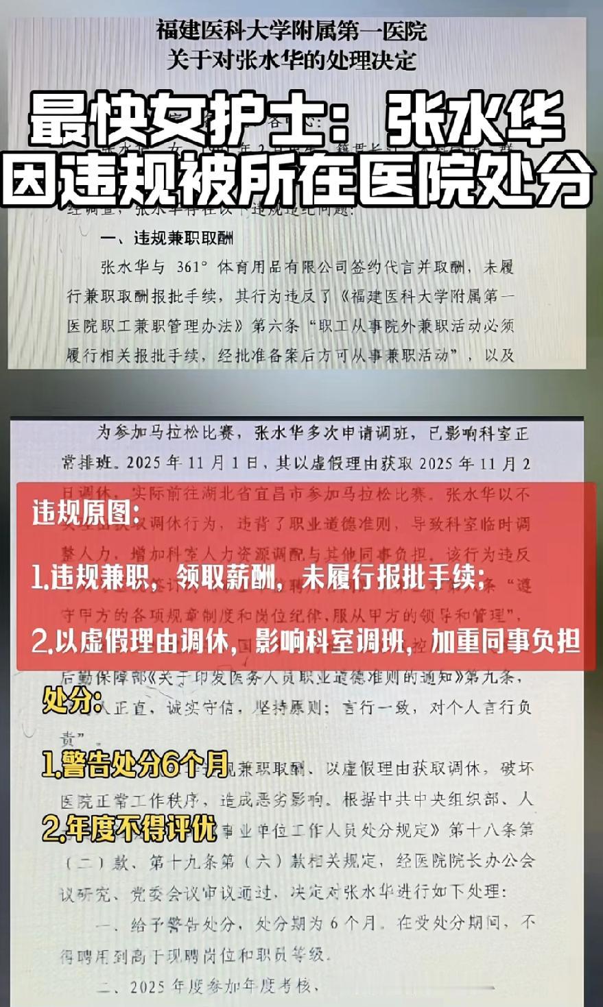 张护士执念太深,11月2号以虚假理由调休去跑马就已经被发现了,11月23号和12月7号,还分别参加了常州与深圳的两场马拉松。 看这份网传处分内容,医院态度也是很明确的,说她跑马已经影响到科室调班,加重了同事负担。 与品牌方签约代言取酬也没走报批手续。 警告处分期为6个月,期间不给评优评先升职加薪,在警告期再收到处分后果更严重,弄不好就直接辞退了! 她单位方面其实已经做到仁至义尽,牺牲他人利益来成就自我,怎么看都是不对的。 后面何去何从,张护士还真得好好考虑考虑了。