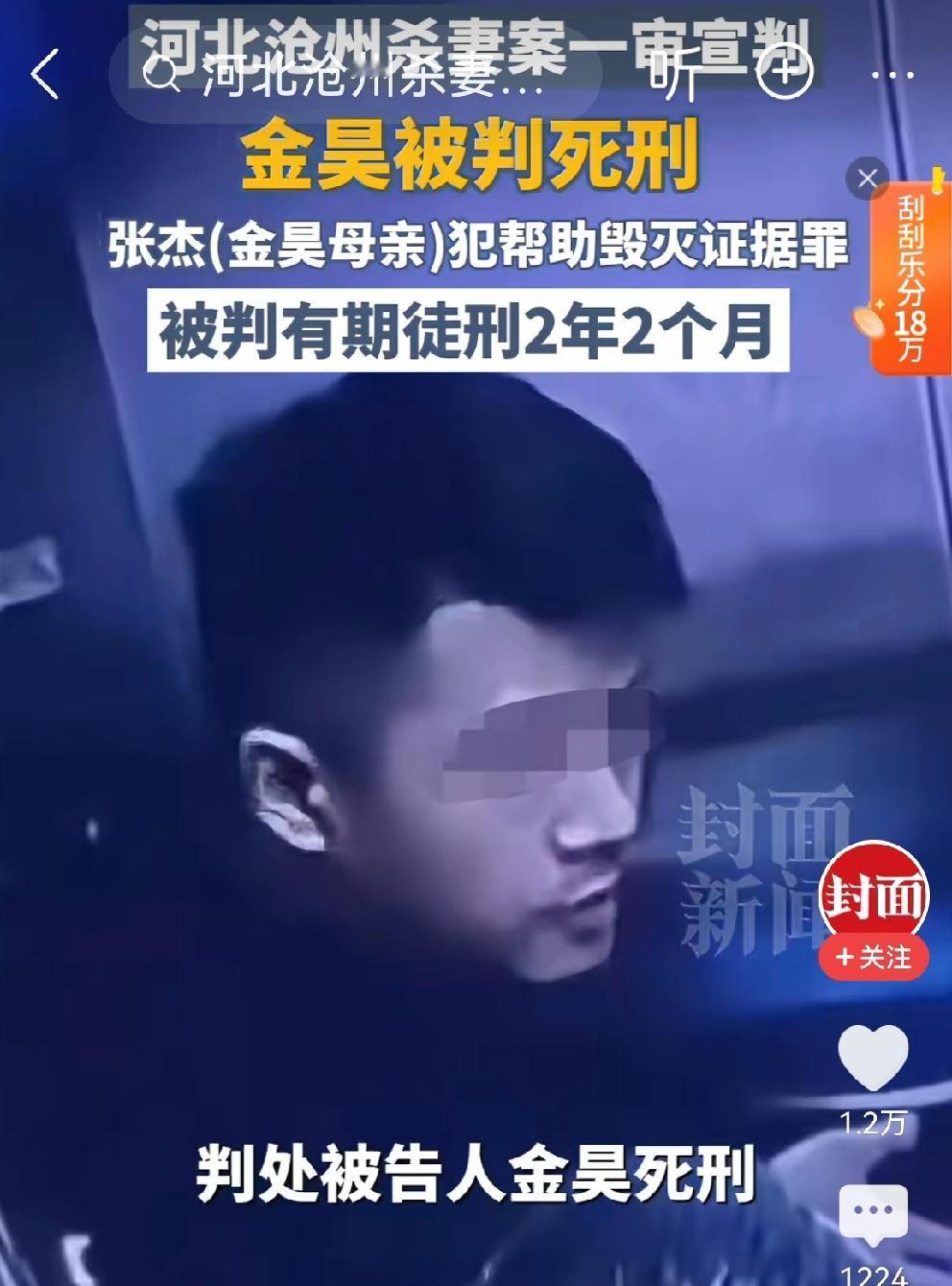 恶人有恶报,判决来得快[赞] 河北沧州杀妻案一审判决: 杀妻凶手金昊被判死刑,剥夺政治权利终身; 凶手金昊的母亲因帮助儿子毁灭证据,被判有期徒刑两年两个月 家暴案凶手被判死刑,这可能是首例,这也是开了中国司法的先河! 这起杀人案惊动全国,也给所有已婚女性警示: 家暴,有一次,就有N次,零容忍。 面对家暴,及时止损的办法就是,离婚,远离渣男,远离伤害! 希望这样的判决结果,能够告慰逝者的在天之灵,抚慰女方父母家人的心[祈祷][祈祷][祈祷][祈祷]