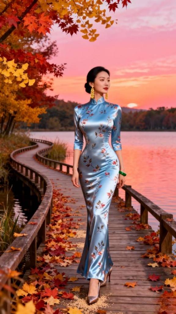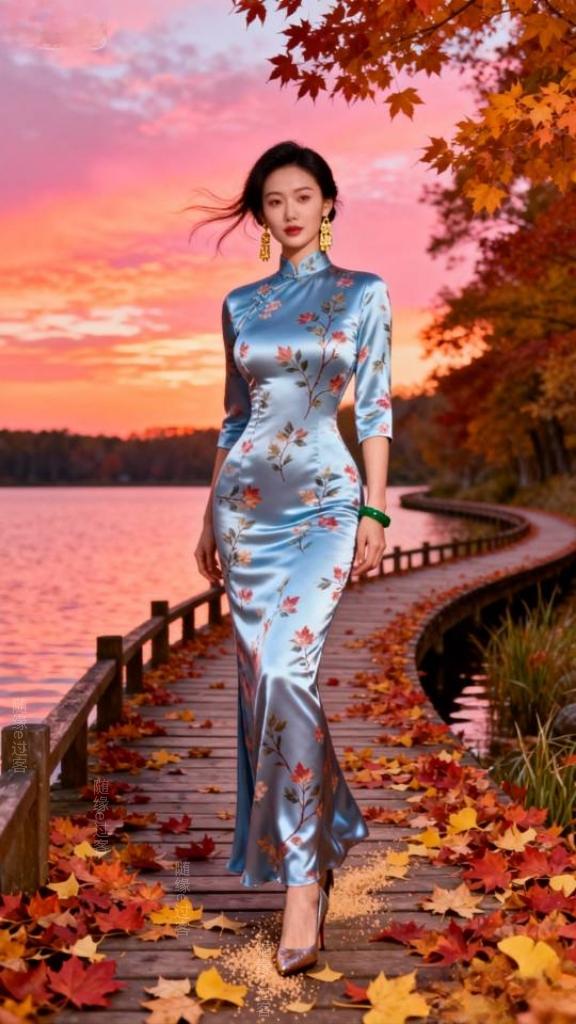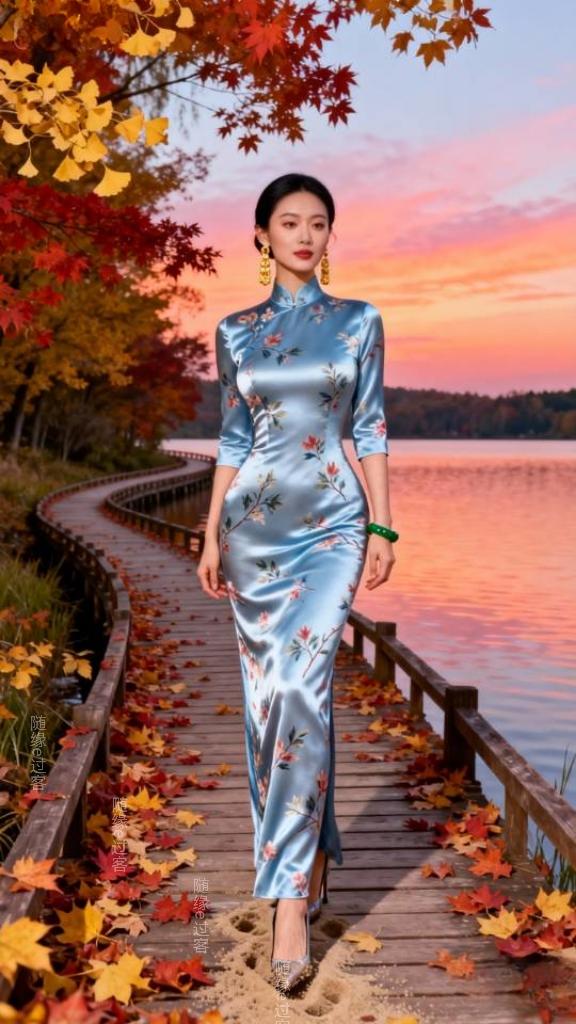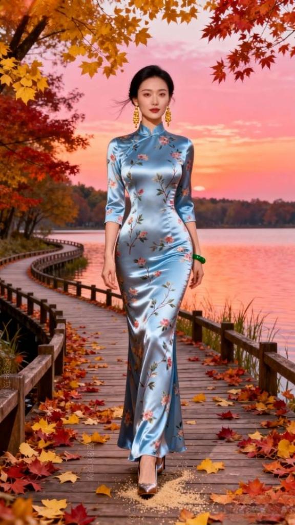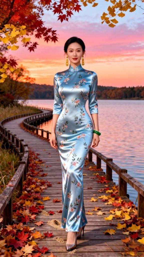 在秋天的湖岸上,一条蜿蜒的木栈道静卧其中。栈道上,厚厚的枫红与银杏黄交织铺陈。澄澈的天空被绚烂的霞光染成了迷人的橘粉色,如梦如幻。微风轻拂,空气中裹挟着湖水那清润宜人的气息以及草木散发的淡淡清香,令人沉醉。一位美丽的旗袍裙女子,漫步于木栈道上,她的身影在光影里舒展,宛如从水彩画里走出的剪影,与湖光、晚霞、秋叶绘成一幅静美的画。旗袍 旗袍美女