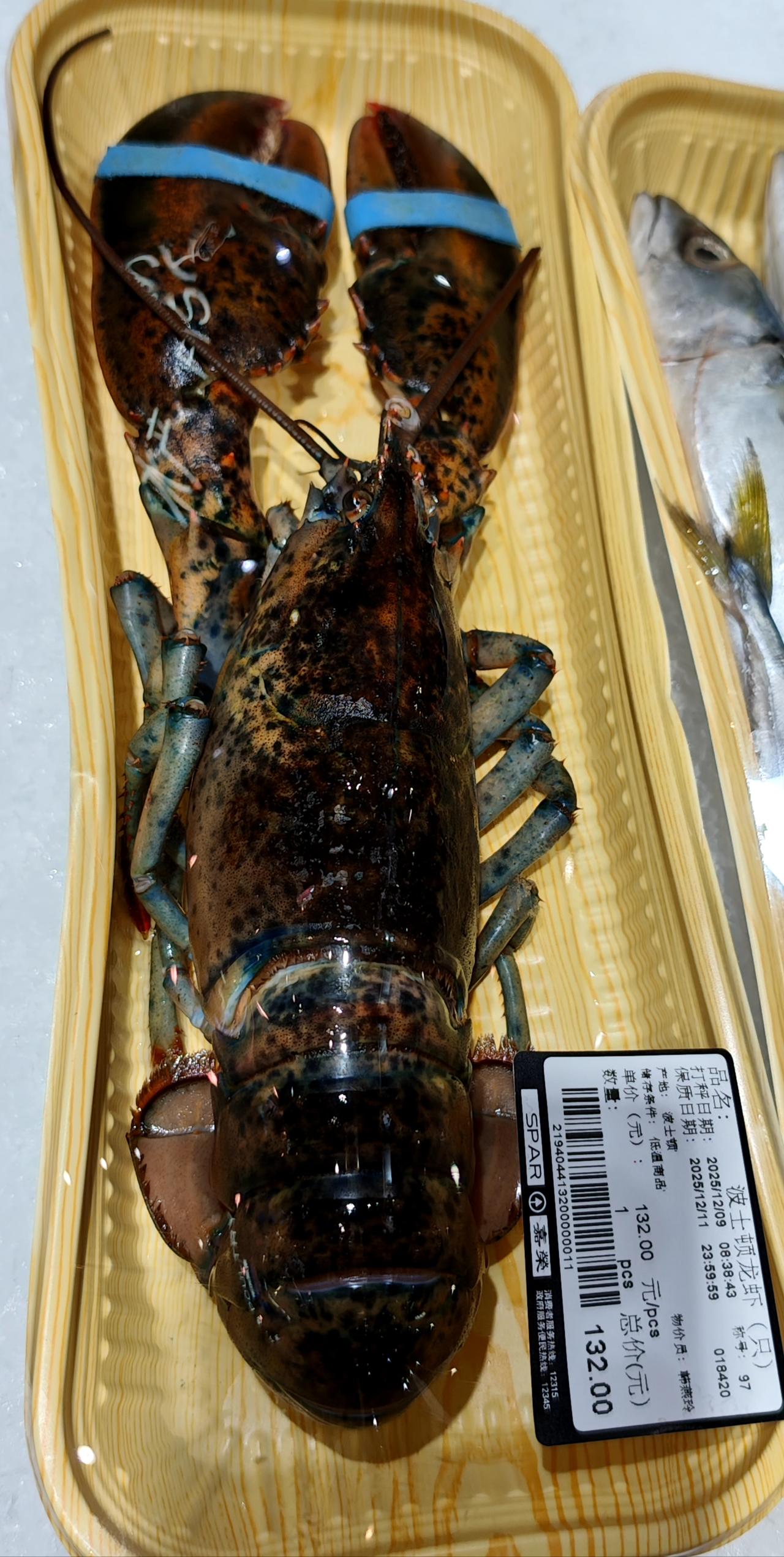 在广州知识城的超市里面有一只波士顿龙虾只要132元,如果在大酒家食就不是这个价钱了,可惜我不会煮。