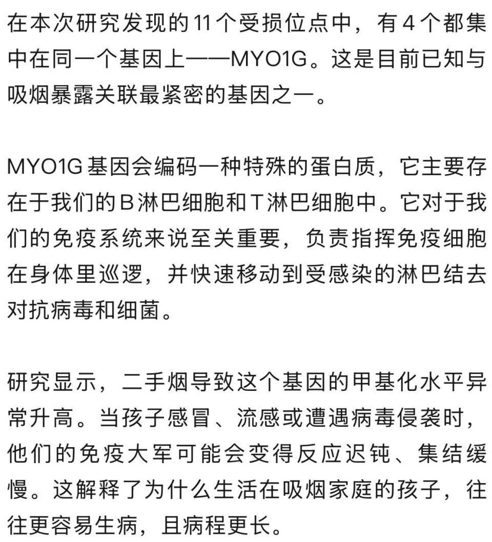 “怀孕期滴烟不沾,生完孩子却疏忽大意?二手烟在儿童体内留下不可逆的基因记号” 夜深人静时,不少新晋父母悄悄溜到阳台抽根烟,心想只要空气流通,孩子就不会受影响。 这种侥幸心理其实早已席卷无数家庭。一份汇集法国、德国、意大利等六国研究数据的欧洲跨国队列调查,却给所有持类似想法的人当头一棒。科研人员发现,即便母亲怀胎十月从未吸烟,只要孩子出生后暴露在有吸烟成员的家庭中,其血液中的DNA调控点就会发生实质性变化——涵盖11处关键基因“开关”。 其中两项变化,是科学界首次见于儿童二手烟暴露。这意味着,孩子对于烟雾攻击有独特敏感期,一旦错过防护窗口,其免疫与呼吸系统很可能遗留难以修复的痕迹。 过去只认为成年人的慢性病源自长年累积的不良习惯,如今越来越多证据指向生活初期的隐性危害。美国国家健康与营养调查报告同样发出警告:在家庭成员每日持续吸烟环境下成长的儿童,患哮喘和慢性阻塞性肺病的概率较普通家庭高出近三分之一。 2019年日本文部科学省调查显示,即便家长选择厨房、厕所等“偏远地带”抽烟,室内空气中微量残留依旧可以通过家居表面反弹存在,“三手烟”对婴幼儿的伤害揭示得纤毫毕现。即使奶奶远房亲戚探望后撒手离开,衣物上的气味仍有机会渗入孩子脆弱的基因防线。 最新研究明确追踪了家中吸烟人数与相关甲基化位点变化幅度之间的正比关系,在这11个特殊基因片段上,越是有人吸烟,变化越明显。 唯一积极的反例来自瑞典一项追踪调查:完全无烟家庭中,儿童的基因“指纹”几乎不见相应变异,这为后续干预和政策制定提供了坚实立场。此外,部分研究也试图考察短暂吸烟与长期吸烟相比的差异,但目前证据显示,哪怕只是偶尔的室内二手烟暴露,也会留下可检测的生物学印记。关于烟草风险的舆论常纠结于直接吸烟者本人的健康账单,而对家庭成员间的隐蔽接触估计不足。 假如决策仅基于视觉和嗅觉感受,实际结果常远远落后于科学事实。 许多人试图借用空气清新剂或强力排风器来减轻烟味,以为能在细节上“钻空子”,殊不知基因层面的破坏早已发生。与之相对照的是,今年丹麦一所医院提出的新提升方案:公共住宅除设定全屋无烟标准外,还推广婴儿看护期间访客不得携带任何吸烟用品进入,效果初步显著。此外,多地学校加大宣传教育,协助部分家长戒烟,使室内外烟雾暴露率得到实质下降,很快可追踪到新生儿呼吸疾病减少。 但这样的解决路径并不简单,部分人反映彻底禁烟措施易引发隔阂甚至代际冲突,有家庭因此关系紧张、出现沟通障碍。 真正严峻的边界还在于社会普遍存有“短时间不在孩子身边就不会有事”的安慰式误判。长期来看,这种认知盲区容易让防护体系形同虚设,随时为不可逆的健康隐患埋单。目前医学尚不能逆转由此在基因层刻下的改变,这也提醒着每一位监护人:孩子出生后的环境控制,比孕期守护丝毫不容马虎。烟危害 家长发现抽烟