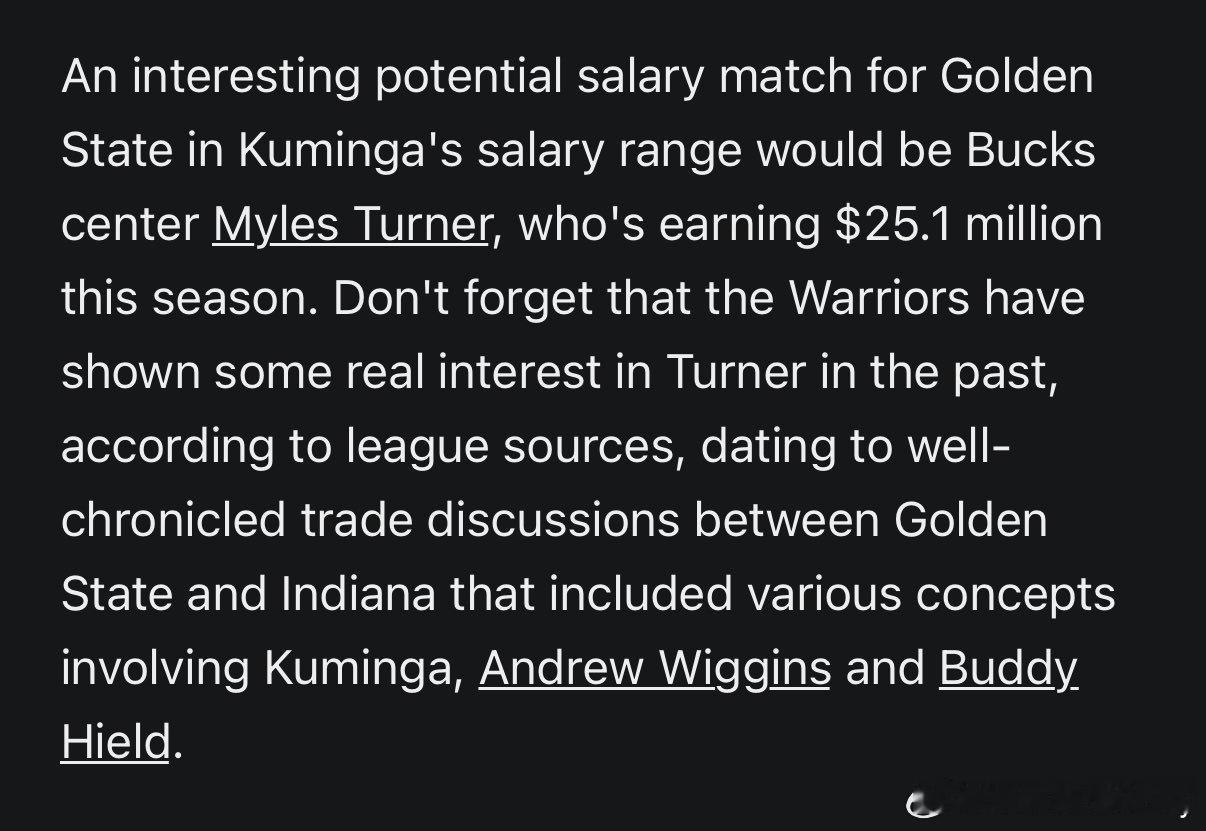 Jake Fischer:库明加薪资范围内,一个潜在薪资匹配对象是迈尔斯·特纳,他本赛季薪水是2510万美元。勇士过去曾对特纳表现出真正的兴趣,可以追溯到勇士和步行者之间那些众所周知的交易讨论,当时涉及的各种方案包括库明加、威金斯以及希尔德。