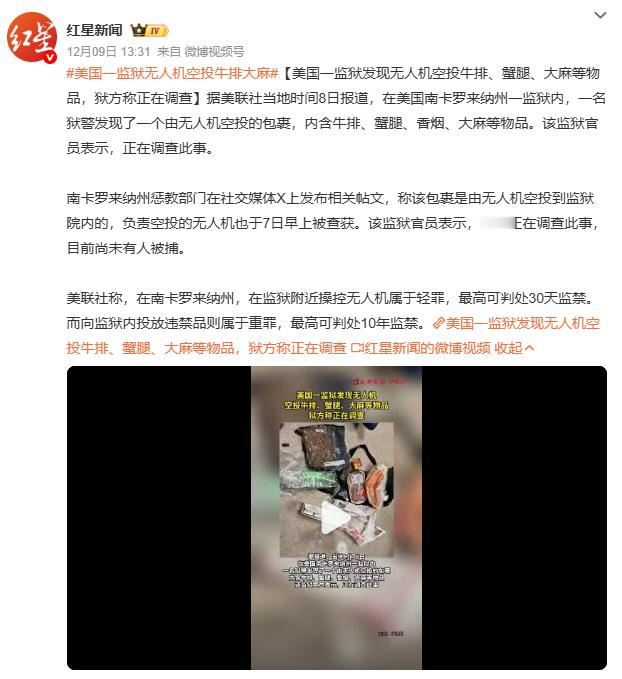 美国一监狱无人机空投牛排大麻无人机空投牛排大麻进监狱,美国监狱管理再曝漏洞。南卡罗来纳州惩教部门披露,此次空投包裹不仅含高价值食品,更混入大麻等违禁品,操控者或面临最高10年监禁。值得注意的是,该州近年已多次发生类似事件,从弹弓投掷到无人机空投,违禁品走私手段持续升级。当“技术犯罪”成为常态,监狱安全防线该如何重构?