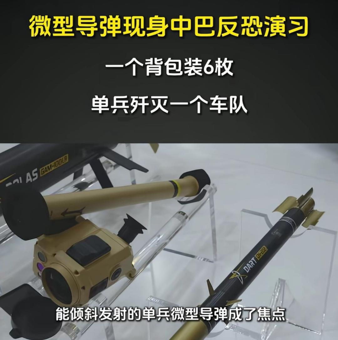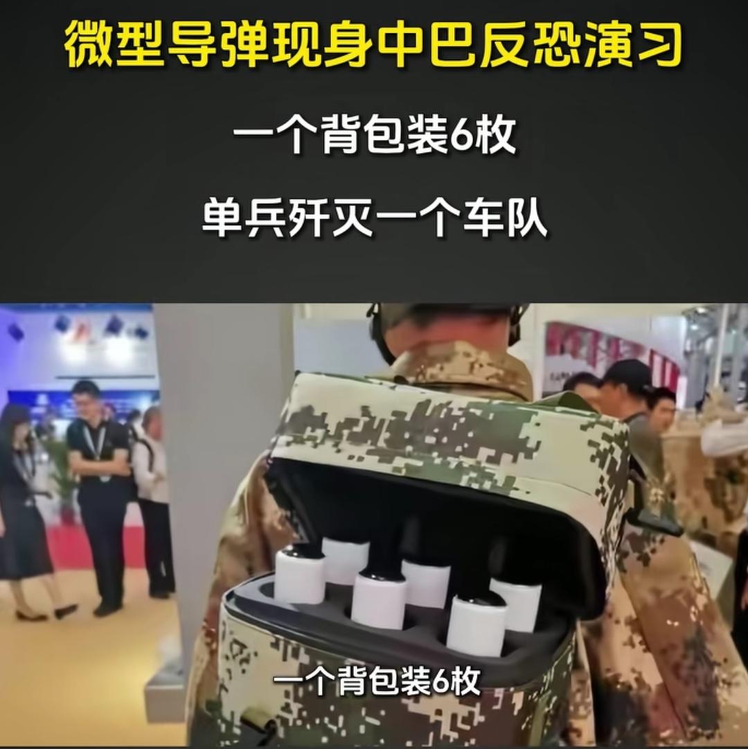 单兵灭车队,微型导弹,一个背包六枚导弹。 (如图所示)中国对巴基斯坦出口的武器越来越先进,除了战斗机飞豹、歼十、自行火炮等大型武器。单兵装备也升级,一个小背包可以容纳六枚导弹,一个兵就可以消灭一整个车队。