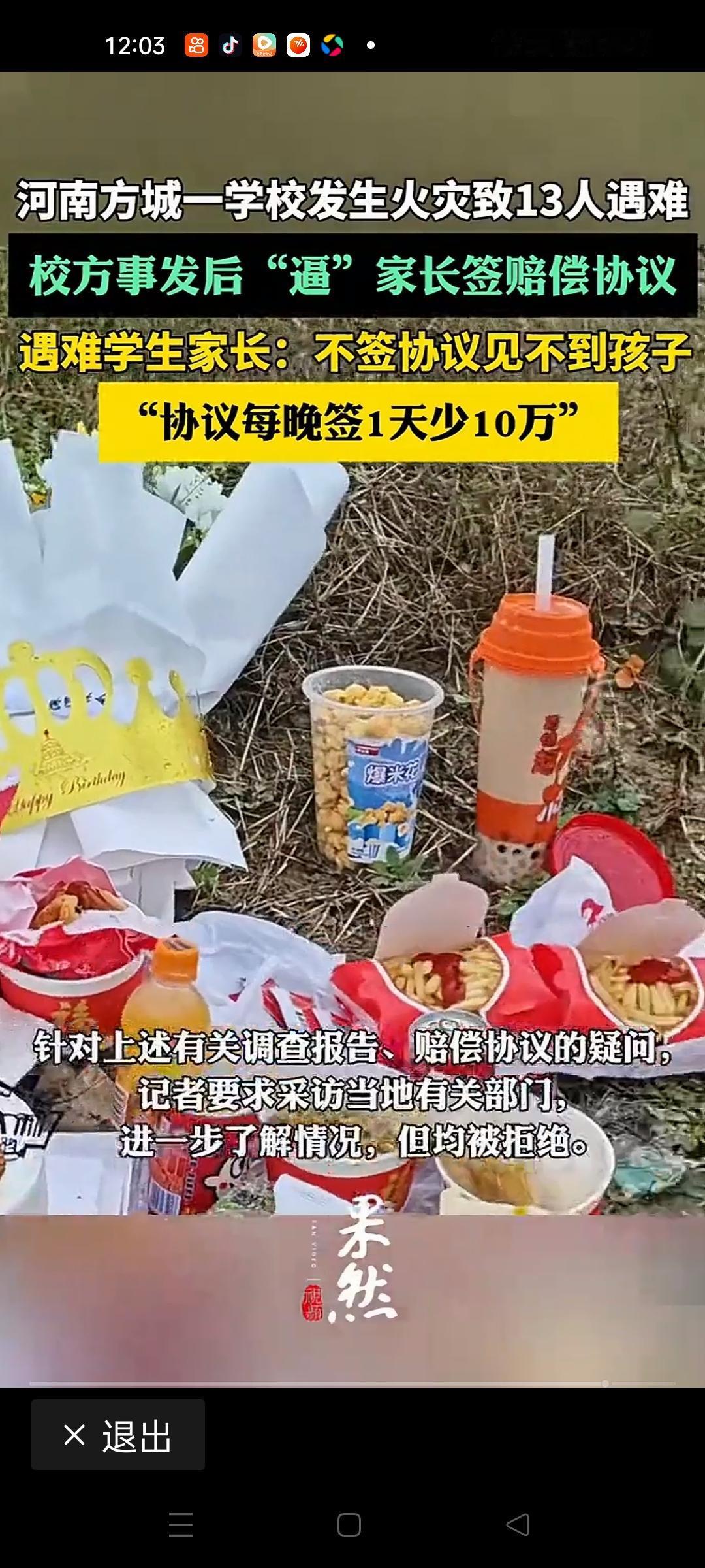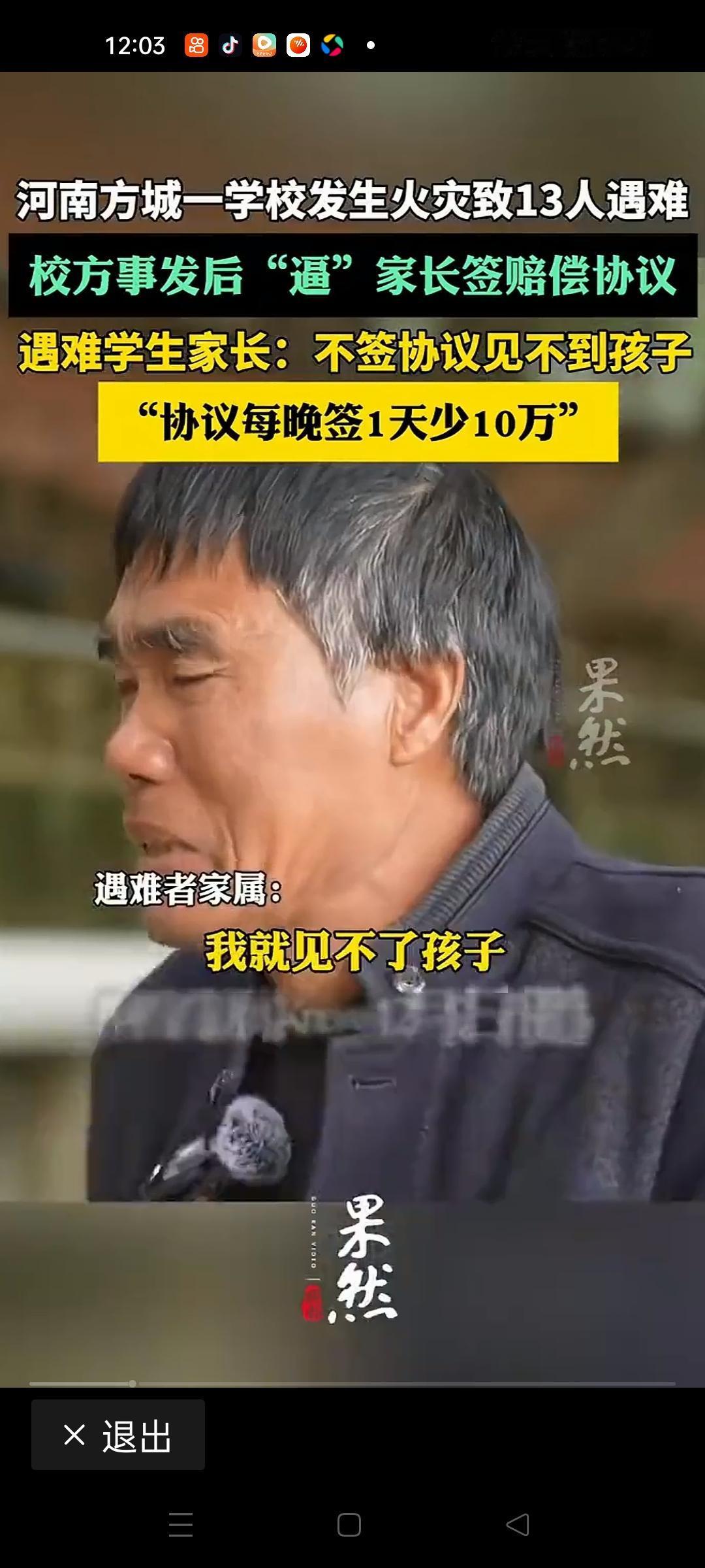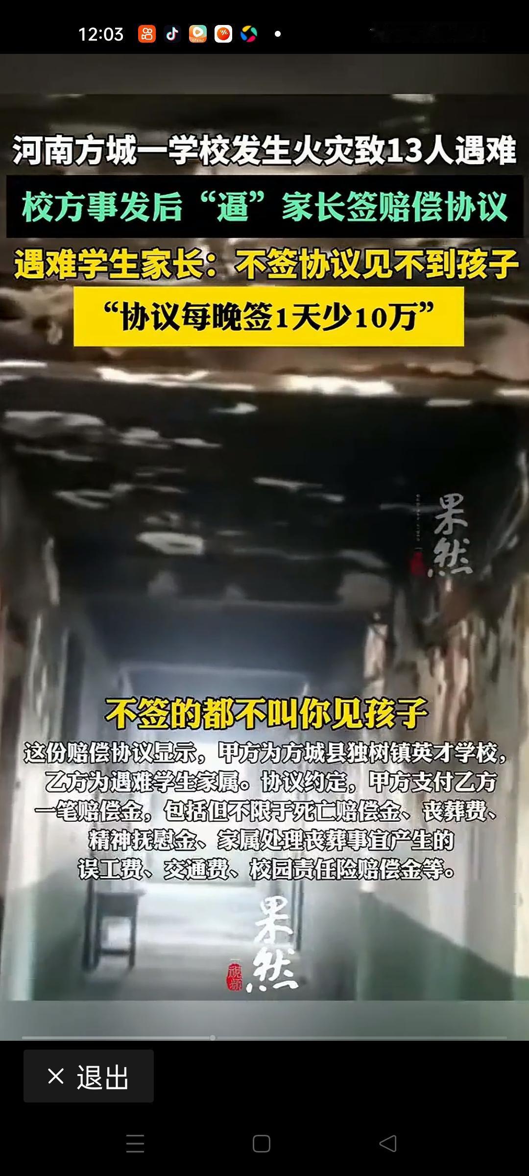 【学校火灾悲剧:13条生命的逝去背后,家属被迫签协议的真相令人震惊】 一场突如其来的火灾,夺走了13个年轻生命,也让无数家庭陷入无尽的悲痛。事故发生当天,现场的惨烈场景依然历历在目:浓烟滚滚,火光映红了夜空。而令人愤怒的是,事发后,家属们面对的竟不是安慰与救助,而是“被迫签协议”。 你是否曾想过,这背后隐藏着怎样的黑暗角落?在悲痛的表面之下,是否有一些我们未曾了解的真相?为什么那些失去亲人的家属,面对官方的“善意”却感到如此无助?他们的签字,是接受了“善意的安排”,还是被逼无奈的选择?这些协议背后,究竟隐藏着什么样的利益角逐和权力博弈? 有人说,事故的发生或许难以避免,但我们不能容忍在悲剧面前出现的“二次伤害”。每一份协议,都应当是家属的自主选择,而不是被操控的工具。火灾让无辜的生命永远定格,但更令人愤怒的是,某些人利用悲痛,操控舆论,甚至试图掩盖真相。 这不仅仅是一场意外,更是一面镜子,映照出我们社会的某些阴暗面。学校安全的漏洞、责任的推诿、信息的不透明,都是导致悲剧扩大化的原因。而更令人心碎的是,许多家属在无助中签下协议,仿佛成为了“悲剧的牺牲品”。 我们要问:这样的“签协议”到底意味着什么?是为了保护责任人,还是为了掩盖真相?我们不能让悲剧成为利益交换的筹码,更不能让受害者的家属成为被操控的“牺牲品”。 这场火灾,留给我们的不仅是13条生命的逝去,更是一次深刻的社会反思。我们需要一个更公正、更透明的机制,让每一个受害家庭都能得到应有的尊重和正义。只有这样,才能让悲剧不再重演,让未来的天空不再阴云密布。 朋友们,你怎么看?面对这样的“签协议”现象,你是否也有同样的愤怒和不满?欢迎留言,一起为那些无辜的生命发声,为正义呐喊!学校火灾悲剧 学生不幸身亡