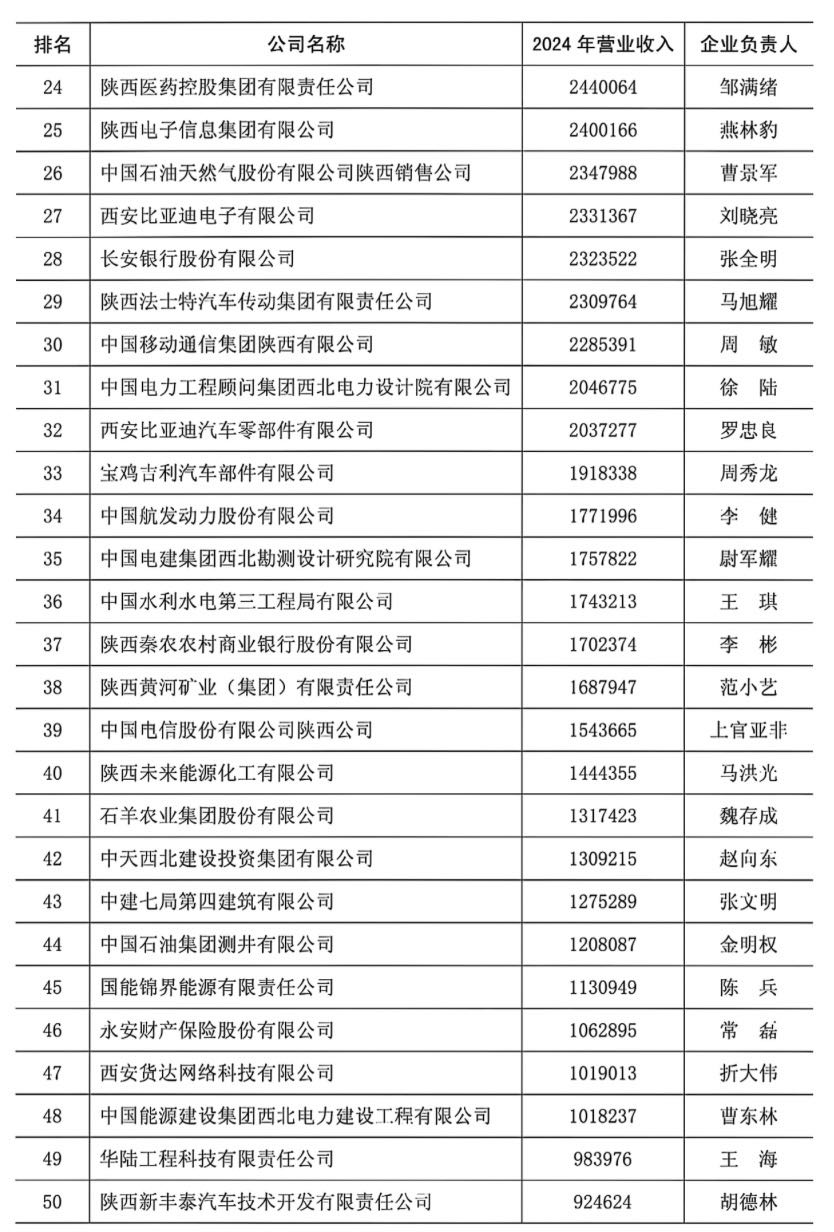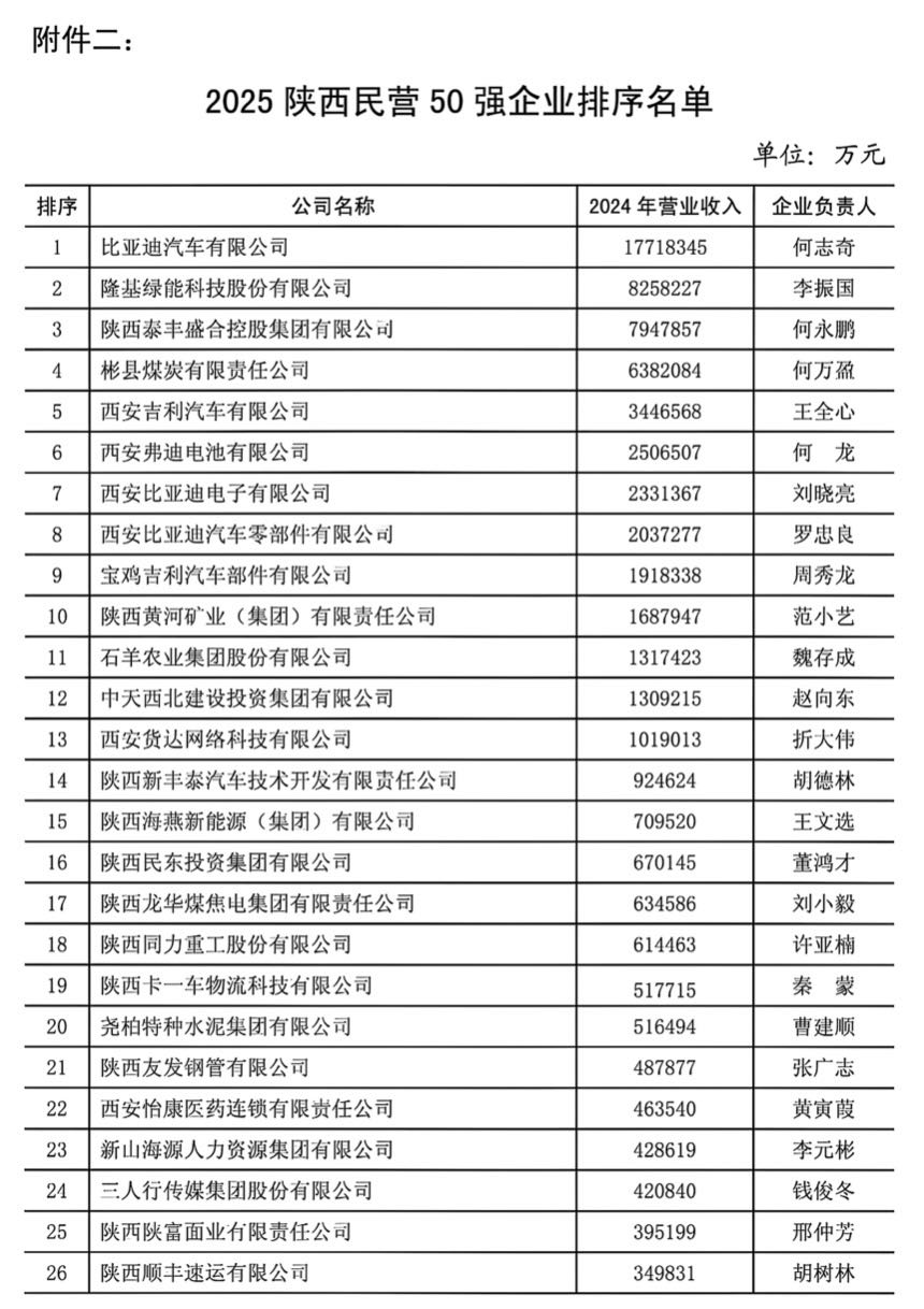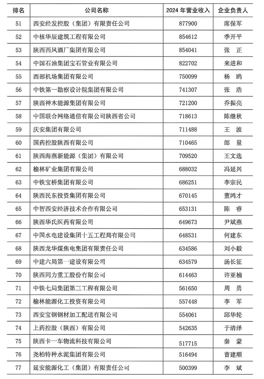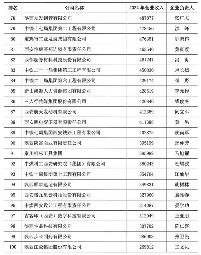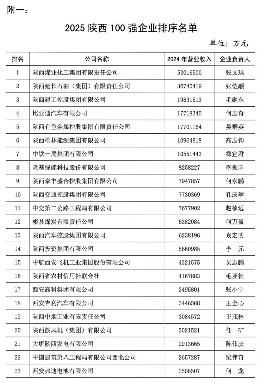 2025陕西100强企业及民营50强企业排序是按照国际通行的方式,参照中国500强企业排序办法,坚持公平公正、不向企业收取费用等原则,依据企业2024年度营业收入,在企业自愿申报的基础上进行排序,并经“陕西省100强企业审定委员会”审定后产生的。现将排序名单予以公布。