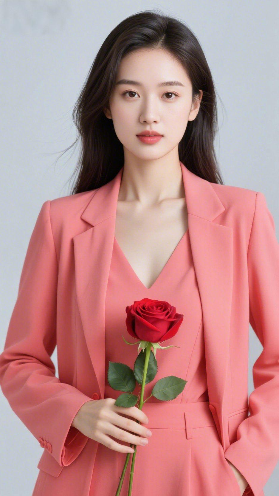 绯色轻光 浅灰底色里,绯粉西装裹着舒展的利落,像把春日的柔霞织进了衣料的纹路里。 她指尖轻拢那支红玫,花瓣的艳色与衣装的柔粉相衬,成了冷调空间里漫开的暖意。发梢带着松柔的弧度,连领口的轮廓都浸着妥帖的舒展——原来干练从不是生硬的模样,是西装肩线里藏着的轻软,是红玫旁她神色里的温然。 这一幕像生活的轻甜注脚:我们既能带着利落的底气前行,也能接住一朵花的柔软。 通勤柔色 绯玫轻章