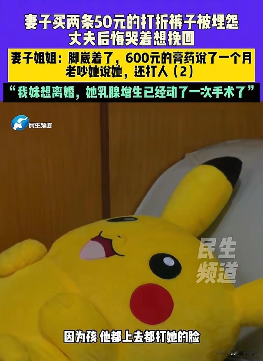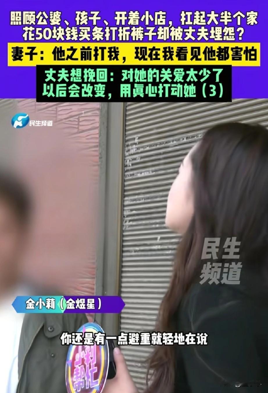 世上没有后悔药!河南,一女子不仅要照顾公婆,孩子,还开一家理发店,扛起了大半个家,然而自己只是花了50块钱买了一条打折的裤子,却被丈夫埋怨和指责,女子下定决心离婚,丈夫又后悔了,想要用真心开挽留妻子。网友:这种男人不是知道自己错了,只是家里一团糟,没有免费的保姆! 根据小莉帮忙节目得知,屈先生和妻子结婚后,他自己外出打工,而妻子婚后不仅在家里照顾老人和孩子,为了能增让生活好点,她学了理发手艺开了一家理发店, 只要屈先生在外面不顺意就会找妻子的茬,看不起她开的理发店,觉得理发店不挣钱,都是妻子拿他的钱在倒贴。 因为夫妻俩经常吵闹,感情也越来越破裂,尤其是屈先生动手的那顺,两个人已经谈不上夫妻了,但是她为了孩子没有选择离婚。 然而,一次的机遇让她彻底想要离婚了,因为花了50元买了一条打折的裤子,就被丈夫各种的埋怨和指责。 如今,屈先生看到妻子坚持要离婚也后悔了,就求助了小莉帮忙,让他们去做做妻子的思想工作不要离婚。 在采访过程中,女子的姐姐提到,她的妹妹因为乳腺增生曾经已经动过一次手术了,现在她又动了一边手术,妹妹曾经脚崴了拿了600元的膏药,就被她丈夫指责了一个月,甚至还动手了。 真不敢想象啊!这是生活在什么样的家庭中,就算妻子花钱,人家自己也挣钱了,花自己挣的,你凭什么。 此事引发热议! 有网友表示,50块钱一条裤子就挨打?那我不是太败家了?我是要么不买,一买就是一百七八一条。 还有一位特殊的网友留言: 我是男人,我支持女方,这样的丈夫不要也罢,离了吧! 老话说,宁拆一座庙,不毁一桩婚,可是这种男人,如果不走的话,后果很难想象到的。
