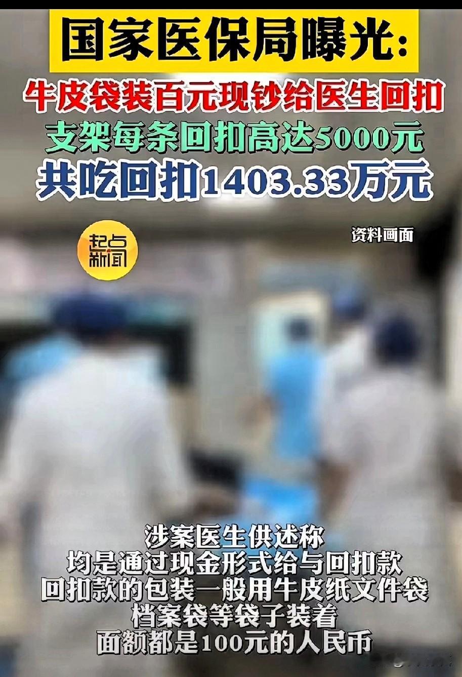 生命有价,医保无价?商医狼狈为奸榨干患者救命钱 上海一家医疗器材商,用最粗糙的牛皮纸袋,装着最肮脏的利益纠葛,在七年时间里,向河北一家医院的多名医生输送了1400余万元回扣。 心脏支架单条回扣5000元,球囊1000元。副院长独吞674万,科室主任揽下662万。按单支架回扣计算,这场黑金交易背后,是足足2800名患者的血泪账单。 白大褂本应象征着救死扶伤的神圣,却被这些医生当成了牟取暴利的工具。多少患者本无需植入支架,却被一句轻飘飘的“建议手术”推上手术台;多少性价比更高的器材被束之高阁,只因回扣不够诱人。 病人们怀着对医生的全然信任,将生命托付,却不知自己早已成了对方的“摇钱树”。每一个冰冷的数字背后,都是一个家庭的无奈与破碎。当医者仁心被利益腐蚀,当救死扶伤沦为一门生意,受伤的,是整个社会对医疗行业的信任根基。